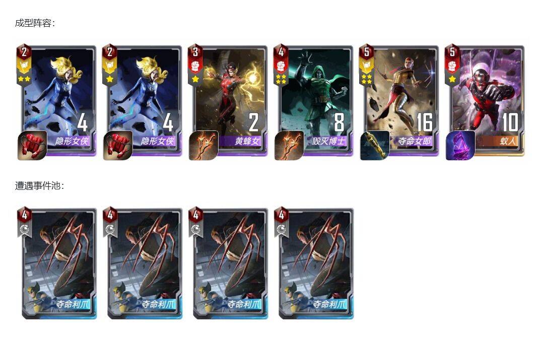 黄蜂女:4张。必须4张!必开链接;前期可用奥马尔吃2星黄蜂女,一边刷新一边有钱,被封印后通过并肩回手;后期看情况卖掉黄蜂女,上2星+1星杜姆,如有需要再买回黄蜂女;在毁灭链接没来之前,配合蚁人万磁王锁血;前期黄蜂女也是战力担当√如果对面贴膜或者比我方身材小,卖掉毁灭链接,走蚁人夺命路线;4张防撕牌,还可以调整黄蜂身材大小。【次核】