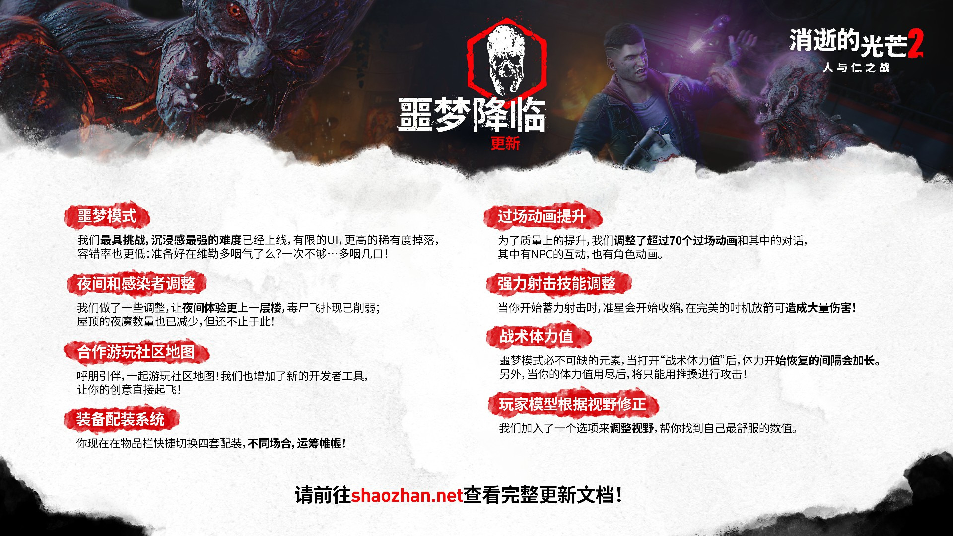 《消逝的光芒2》“噩梦降临”更新现已正式上线,为游戏引入了最高难度“噩梦模式”,专为想要挑战自我并领略《消逝的光芒》世界中噩梦般现实的玩家量身定制,制作组希望通过高难度的挑战、极简的UI给玩家提供最紧张刺激且身临其境的游戏体验。