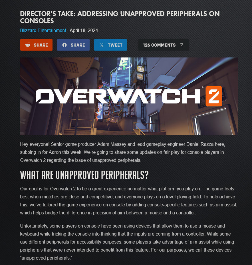 暴雪日前阐述了如何打击在《守望先锋 2》主机上使用“未经批准的外围设备”的行为,该公司的多管齐下解决方案包括永久封禁某些玩家。