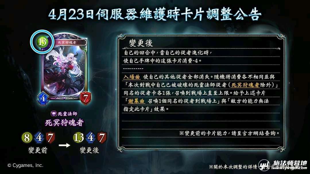 入场曲 使自己的其他随从全部消失。随机将消费不相同并与「本次对战中自己已被破坏的死灵法师随从(死冥狩魂者除外)」同名的随从卡各1张,召唤到战场上至上限。给予上述卡片「谢幕曲 召唤1个同名的随从到战场上」与「敌方的能力无法指定此卡片」效果。