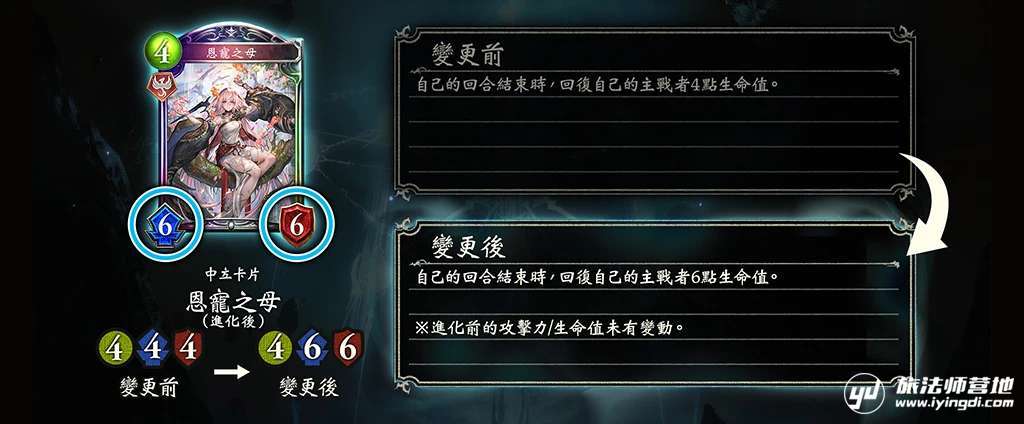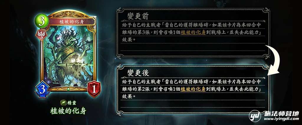 → 给予自己的主战者「当自己的护符离场时,如果该卡片为本回合中的第2张,则会召唤1个植被的化身到战场上,并失去此能力」效果。