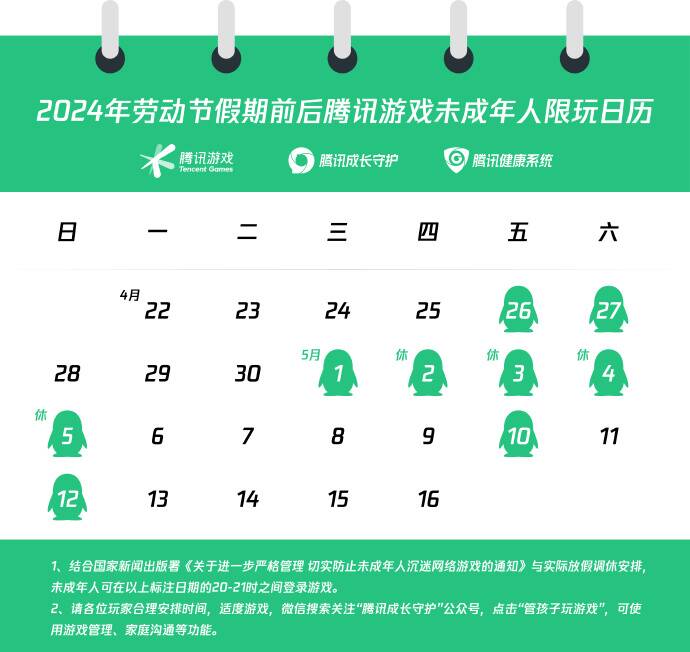 今日,腾讯游戏发布了2024年劳动节假期前后未成年人游戏限玩通知:未成年玩家仅能在4月26-27日、5月1-5日、5月10日、5月12日的每日20-21点之间登录游戏,25天时间总计9小时,其余工作日及调休上班的4月28日及5月11日均为禁玩时段。