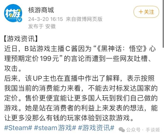一直以来,《黑神话:悟空》的售价确实是比较受人关注的话题,每隔一阵子就有售价相关的讨论,就像是价格还未公布前的小米汽车一样,因此一些网友也将《黑神话》叫成是“赛博SU7”。