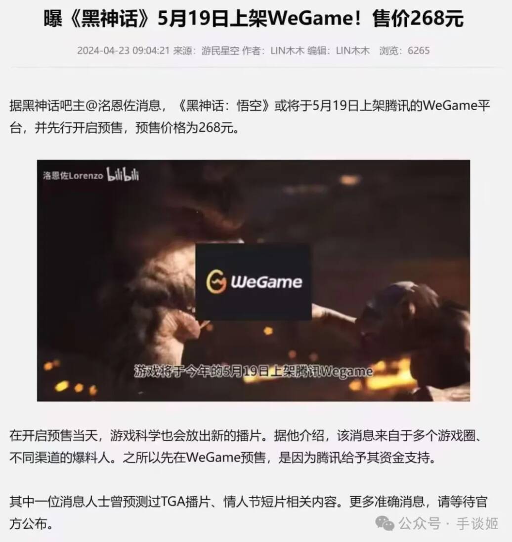 虽然游戏目前还未进入肉眼可见的大规模宣发阶段,玩家间却对这款游戏关注有加,比如对售价的讨论就一直持续不断,这不,今天又出现了一些小道消息,根据黑神话贴吧吧主介绍,《黑神话:悟空》可能于5月19日在wegame开启抢先预售,最低售价268元。(消息未经验证)