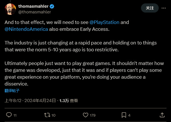 Mahler 还在后续推文中鼓励索尼和任天堂也“拥抱抢先体验”:“这个行业正在快速变化,坚持 5 到 10 年前的常态做法限制太多了。”