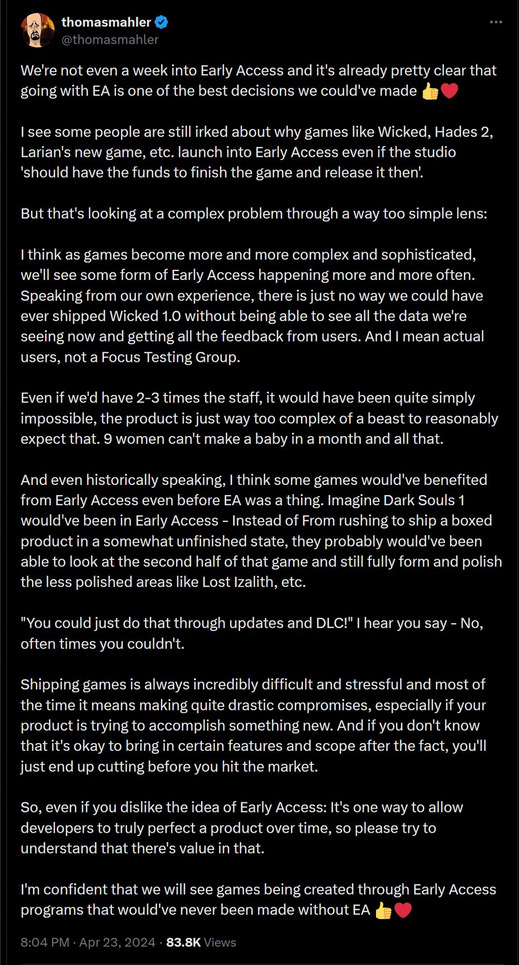 他写道:“我看到游戏人仍然对为什么即便工作室‘应该有资金完成游戏并之后发布’,像《恶意不息》、《黑帝斯2》、拉瑞安的新游戏等作品依然要推出抢先体验感到不满。但这只是通过过于简单的视角来看待复杂的问题。”