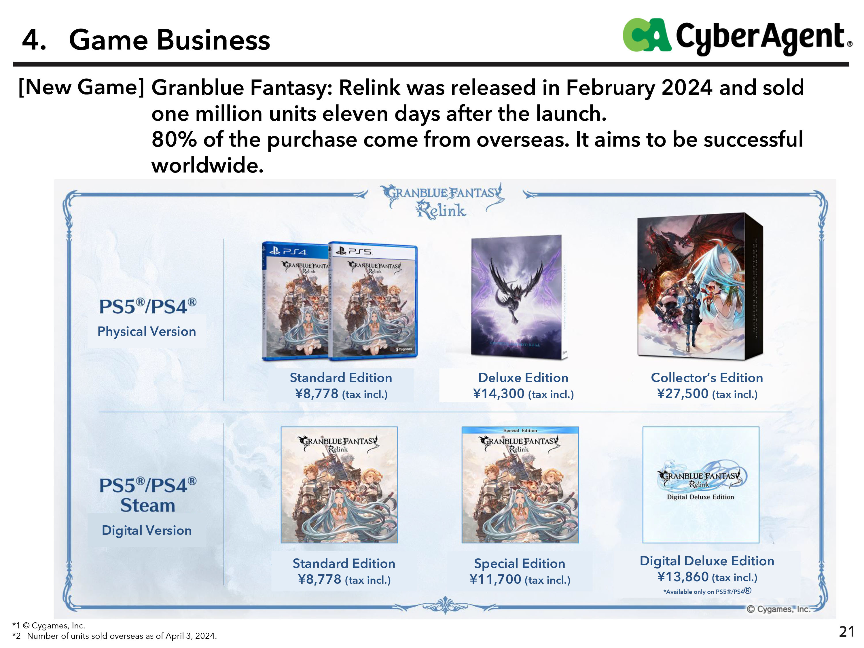 根据CyberAgent的2024年第二季度财报显示,《碧蓝幻想:Relink》在发售11天后销量突破了100万,并且其中有80%的销量来自日本以外地区,CyberAgent是《碧蓝幻想:Relink》开发商Cygames的母公司,CyberAgent认为《碧蓝幻想:Relink》将在全球范围内获得成功。
