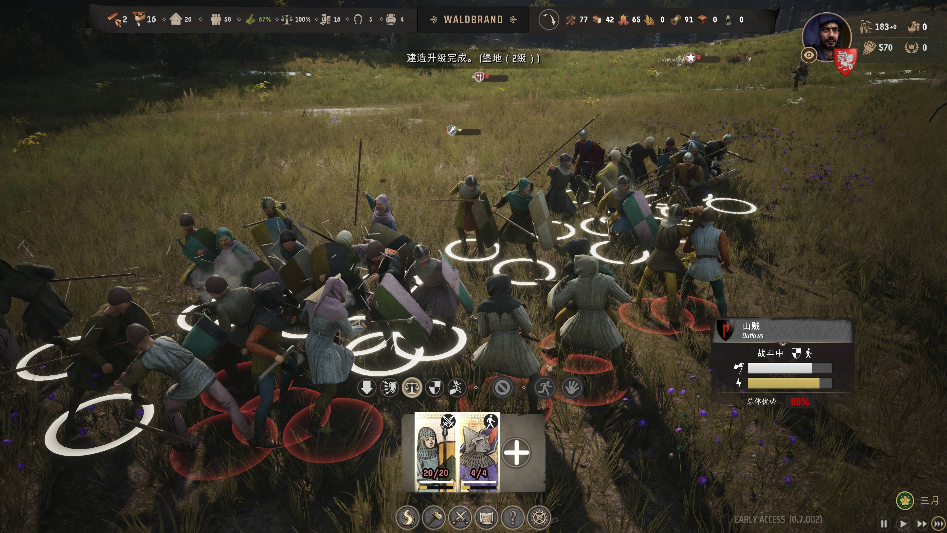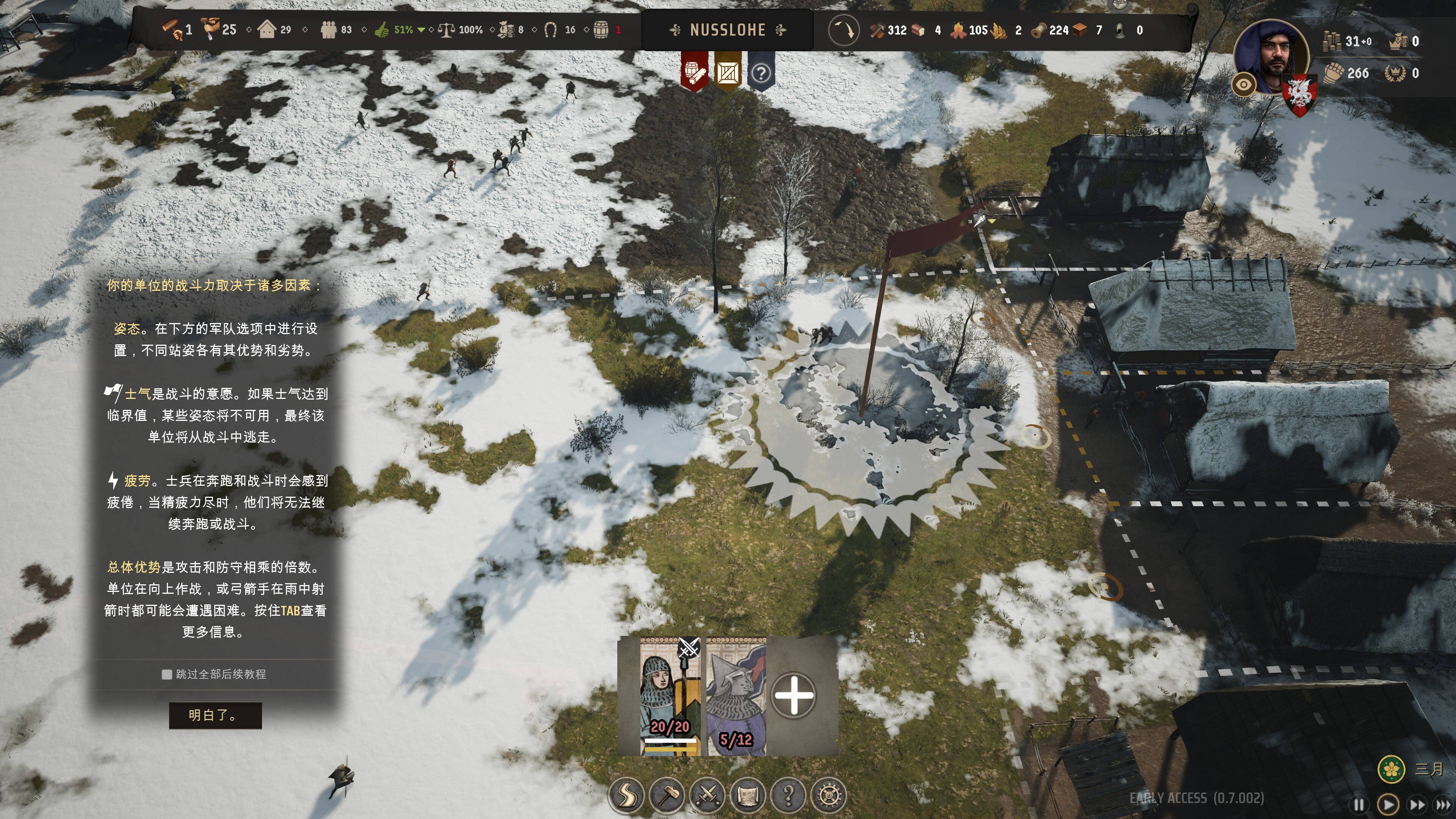 在游戏中,玩家需要组建自己的民兵队伍,这是进行战斗的基础。通过点击游戏下方的两把剑的栏位,玩家可以查看军事的详细情况,并在这里组建各种民兵单位。每个民兵单位都有自己的武器和装备,玩家需要根据战斗需求来合理配置。此外,玩家还可以选择雇佣兵来增强战斗力,但需要注意的是雇佣兵不如自己的民兵可靠,需要谨慎使用。