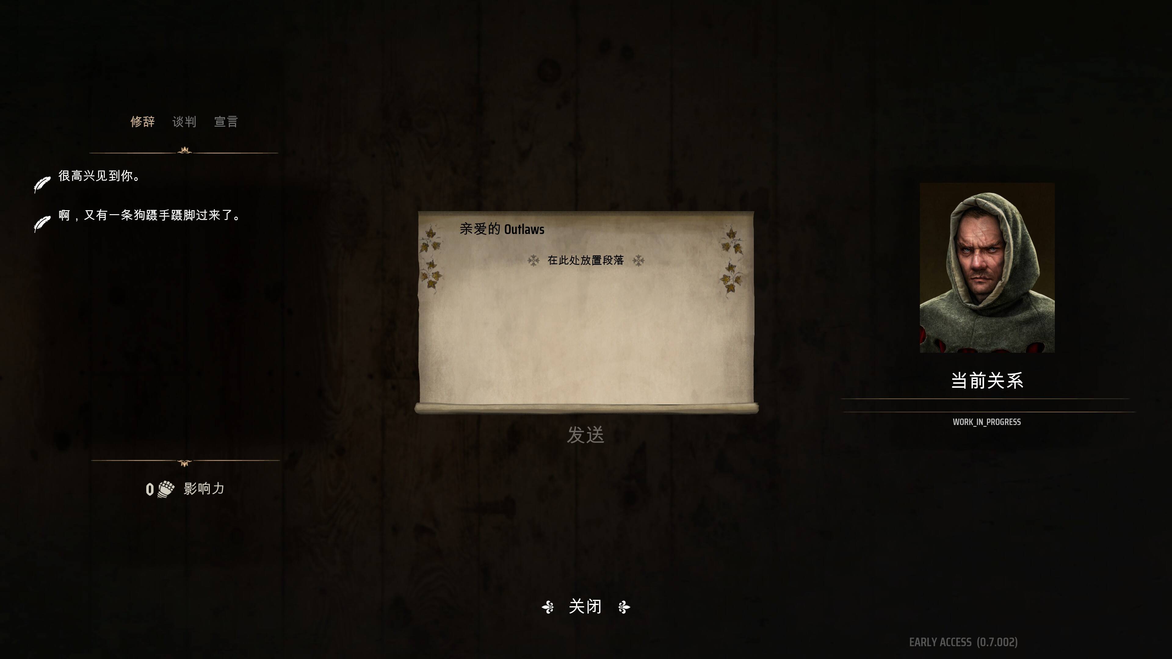 游戏的外交系统目前也不完善,并且领土上没有其他领主,这样在战斗方面就缺少了很多乐趣,目前也地图主要只有强盗和从边缘来的敌人,虽然开发团队也有说这款游戏的战斗规模没有那么大,但是依旧希望以后能在这里加入更多玩法。
