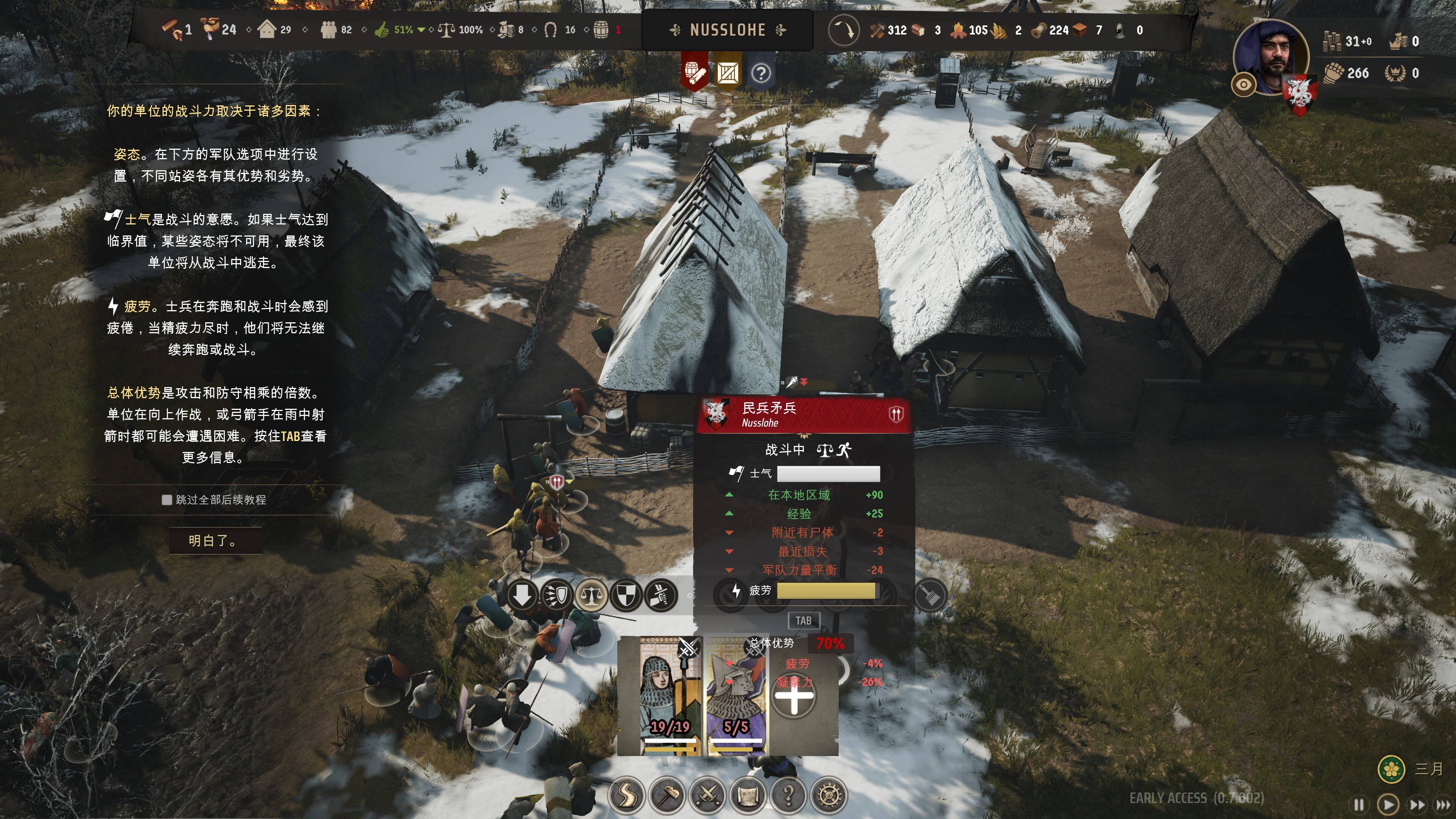 在战斗准备阶段,玩家需要选择合适的民兵单位,并通过点击英雄集结按钮将它们派遣到指定的地点集合。在移动民兵的过程中,玩家需要关注民兵的疲劳值和士气。长距离的移动和长时间的战斗会使民兵的疲劳值迅速上升,导致战斗力下降,而士气则受到所处位置、环境和民意等多种因素的影响。因此,玩家需要合理安排民兵的移动和战斗节奏,以确保他们在战斗中保持最佳状态。