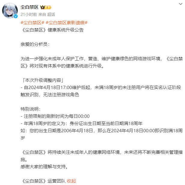 《尘白禁区》手游官方微博昨日宣布,为进一步强化未成年人保护工作,营造、维护健康绿色的网络游戏环境,《尘白禁区》将对现有体系中的健康系统进行升级。自2024年4月18日17时维护后起,未满18周岁的未注册用户将在实名认证阶段触发识别,无法注册游戏角色。