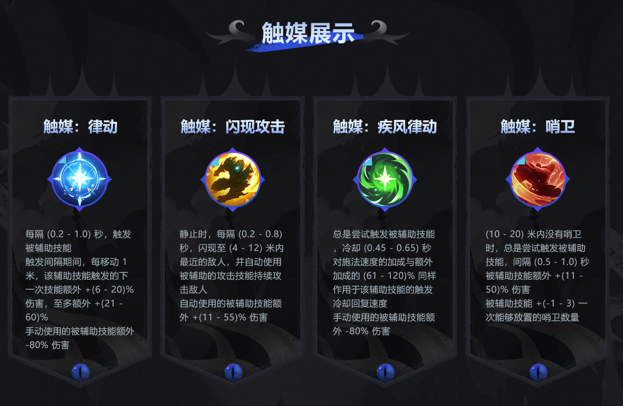 作为本赛季的新要素之一,触媒是一类全新的辅助技能,其效果是帮助猎人自动触发主动技能,为主动技能带来额外的效果。不同的触媒都有不同的效果和触发条件,譬如【触媒:律动】就会每个1秒自动触发绑定的主动技能,并且根据移动距离提高额外伤害。