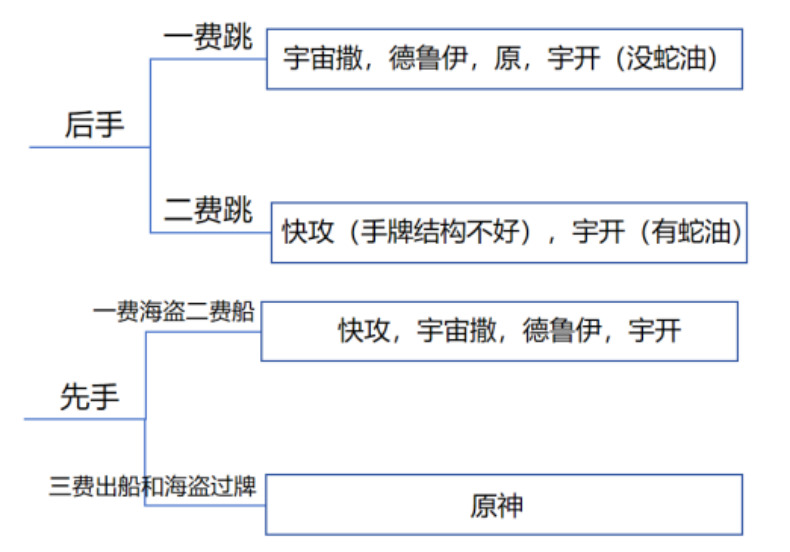 这里讨论一下玩具船和一费海盗同时在手的常见对局的不同打法。如果我们是后手,那么我们面临的问题就是选择一费跳玩具船还是二费跳币让船和一费海盗一起出。以我们的经验来看萨满,德鲁伊,和牧师的宇宙卡组往往在两费缺少有效的单解手段,对阵这些卡组时可选择一费跳玩具船,二费出海盗。如果帕奇斯未射手,则能过两张牌,此时手中若还有一费海盗则可以再多过一张。而面对快攻卡组时,可根据手牌结构进行判断,如果手牌结构不错,有足够的应对快攻的强卡(如教授,姐夫暗影步等),则可以一费出海盗方便解场。在面对宇宙开门法时,如果对手一费挂任务则可以一费跳船,对手能解咱们船的手段大部分情况只有初始之火,可以去赌一下。如果对手一费出蛇油商人则可以选择二费出船进行过牌。先手有玩具船的选择可能略复杂一些(如果有**可以参考后手打法,但因为先手手牌比后手少一张,可根据实际情况选择),但如果我们没有**,将面临的选择就会是一费出海盗二费下船不过牌来拿场面,还是等到三费再出船和海盗进行过牌。面对快攻,场面是极为重要,我们选择一费出海盗去抢场面拿先手,相比把先手让给对面再等到两回合后过牌优先许多。面对德鲁伊萨满缺少单解的卡组一费下海盗去强血依然是不错的选择。先手对阵宇宙开门法,我非常推荐第一回合下一费海盗,以鱼排斗士为例,有时对手不舍得跳币解掉我们而去挂任务,我们就可以多踹3血,如果手中没有初始之火和蛇油商人,对手大概率需要跳币解火冲解我们,那样对手可以少一个任务进度,也能破坏一下对手的节奏。而面对40宇暗时,抢场面便变得弱小无力了(因为不管怎么抢都打不赢bushi),可以等到三费去过牌搏之后组合技的可能性。整理后如图,