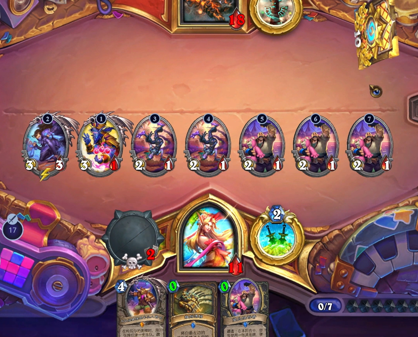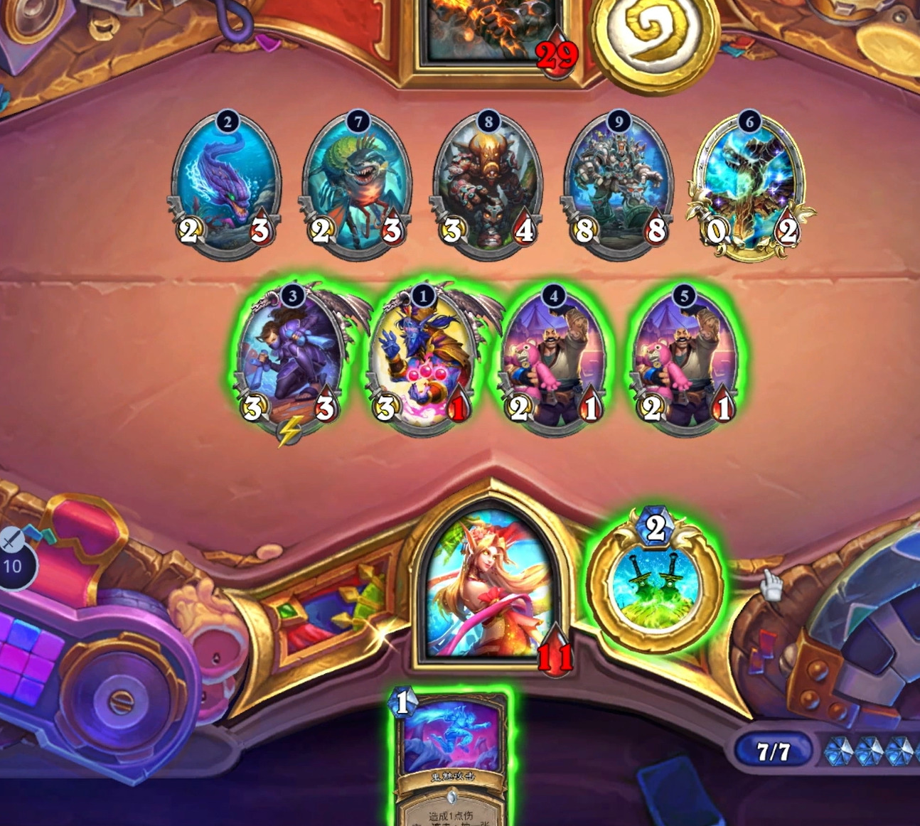 二费2/3的身材还算扎实,宇宙贼本身缺少二费节奏,二费裸打出去站场也不亏。在之前未出一费海盗的情况下配合硬币能在二费时有一个不小的场面,并且能多过两张牌,可以说是性能强大。不能小看前期的过牌,在前期手牌数量少,虽然宇宙贼的费用曲线比较低,但依然常常因为手牌结构不好而导致只能二费转刀三费裸下大范,这多过的两张牌有效缓解了这一尴尬局面,让后续的节奏更加丝滑。且在中期打出配合海盗过牌也提高了一费海盗本身在中期的价值,让一费海盗在中期显得没那么鸡肋(玩具船的机制时先抽牌再从牌库召唤帕奇斯,所以如果你抽牌抽到帕奇斯,那就相当于没抽,还让帕奇斯射手了哈哈哈)。