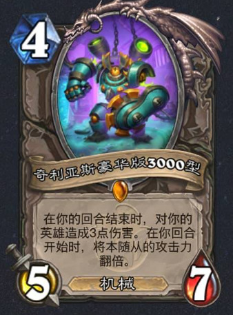 而宇宙贼真正缺少的是类似大范的有巨大威胁的强力站场,失控模块和能量模块恰好弥补。四费七血的屁股不可谓不超模,看似是5/7,实则是10/7。奇利亚斯这张卡是越早出越强,后手有硬币,卡组也带了殒命暗影和伪造的幸运币。最胡不过一费出,基本直接宣告游戏胜利,二费出也是家常便饭,能给对面带来很大的场面压力。两费出对阵不糊的快攻,你比他斩杀更快,他反而要来解你的场,七血的大屁股能替你解掉对面许多随从;对阵慢速,依然能带给他很大的场面压力,如果三费还能出个小塞,不管什么卡组都得汗流浃背。配上一张究极爽局,一费出奇利亚斯,二费出小塞,三费对手投降完美节奏。