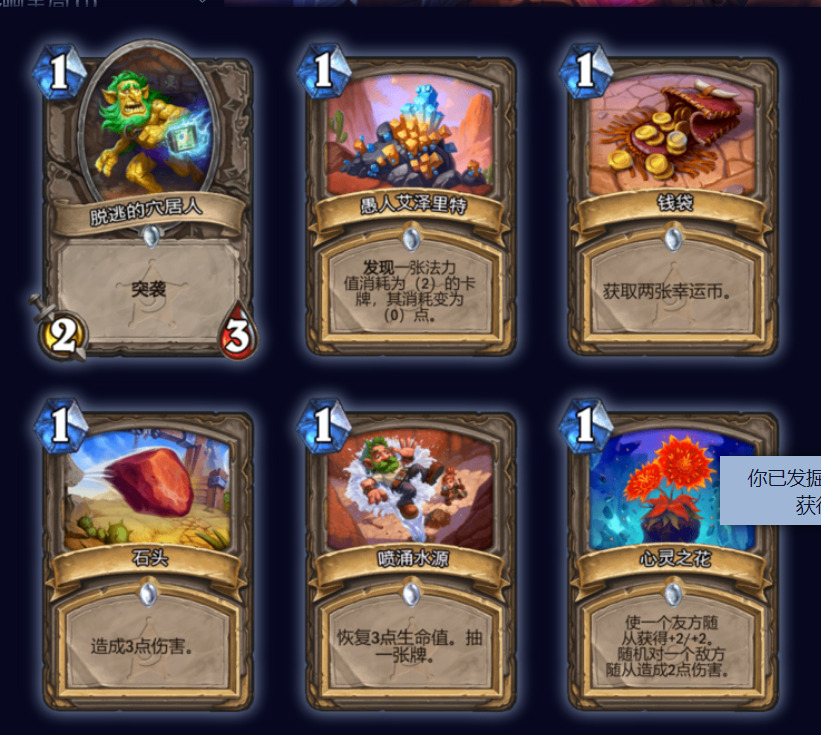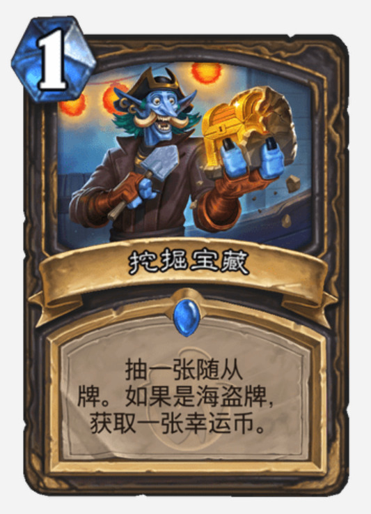 挖掘宝藏这张卡能说的没有太多,一费抽一随从,一张不错的质量卡。值得一提的是如果手里有玩具船,但是没有一费海盗,可以用这张牌去搏一下,我们这一套有14个随从,包括帕奇斯其中有5张是一费海盗,加上上手的随从,抽到一费海盗的概率的大约为百分之40左右,如果真抽到,可以不着急打出,在二费时跳币配合玩具船进行一波过牌也是不错的。有时配合索尼娅也有意想不到的效果,两张抽到一个海盗就相当于free了。