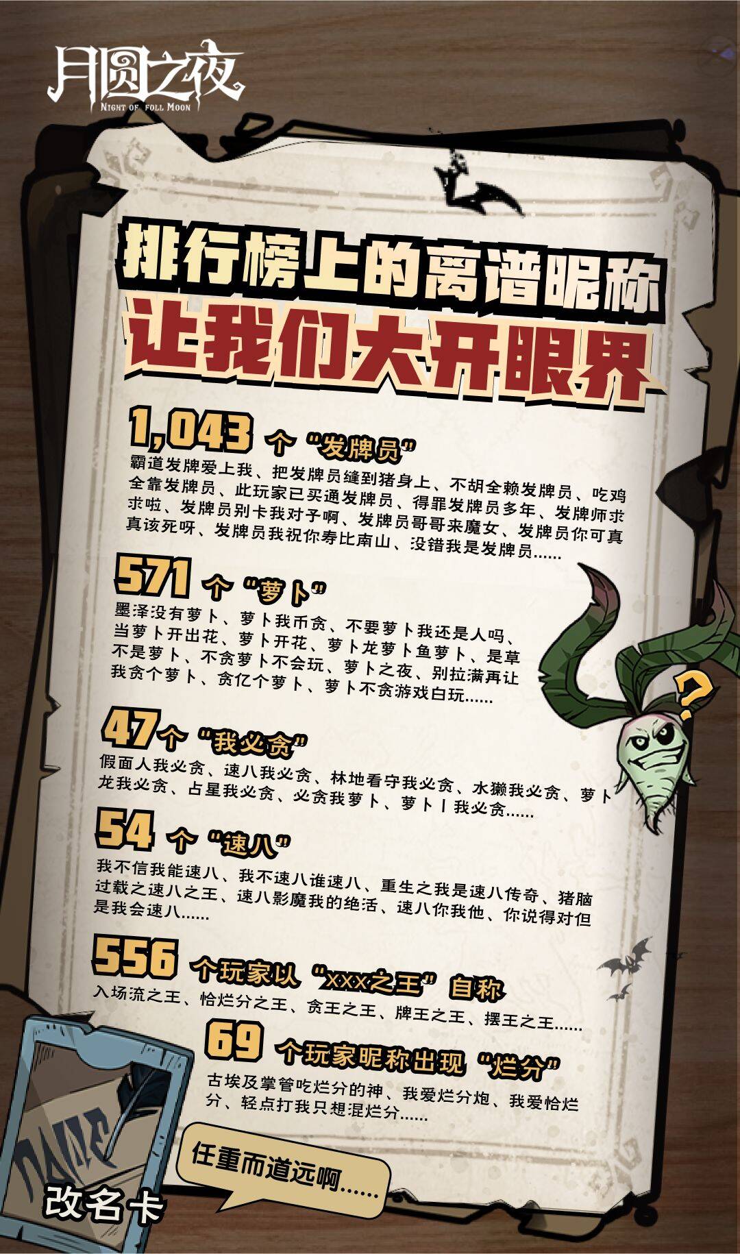 排行榜上的离谱昵称也让我们大开眼界,“发牌员”与“萝卜”的查重率太高吧喂!