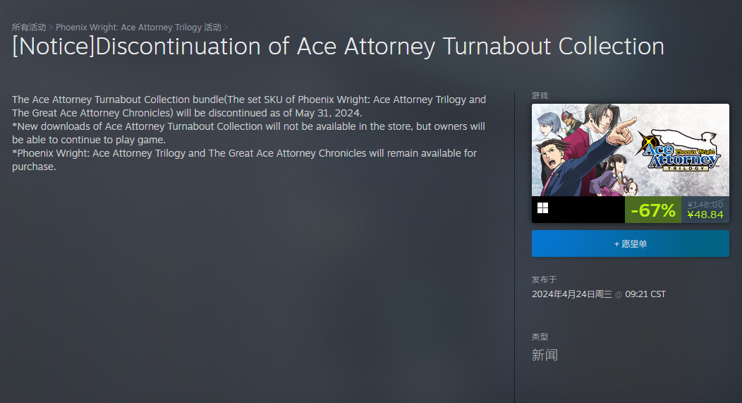 不过近日卡普空官方宣布,将在2024年5月31日正式从Steam上下架《逆转裁判:逆转合集》。届时Steam商店中将不会提供新的《逆转裁判:逆转合集》下载,但已经拥有的玩家可以继续游玩。