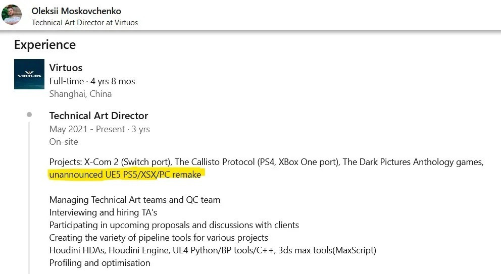 这位员工叫Oleksii Moskovchenko,是维塔士工作室的技术艺术总监。其资料称维塔士正在开发一款基于虚幻5引擎的重制版游戏,将登陆PC、PS5和XSX|S平台。虽然没有提到游戏名称,但许多网友认为这就是B社的《上古卷轴4:湮灭》。