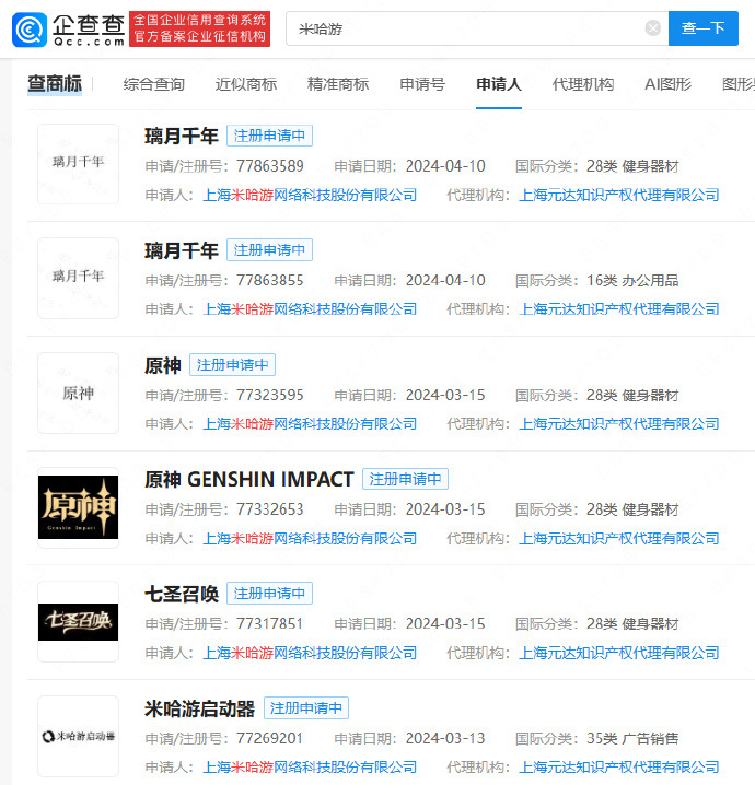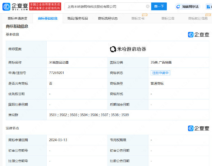 此外,即将上线的“米哈游启动器”也已注册商标。