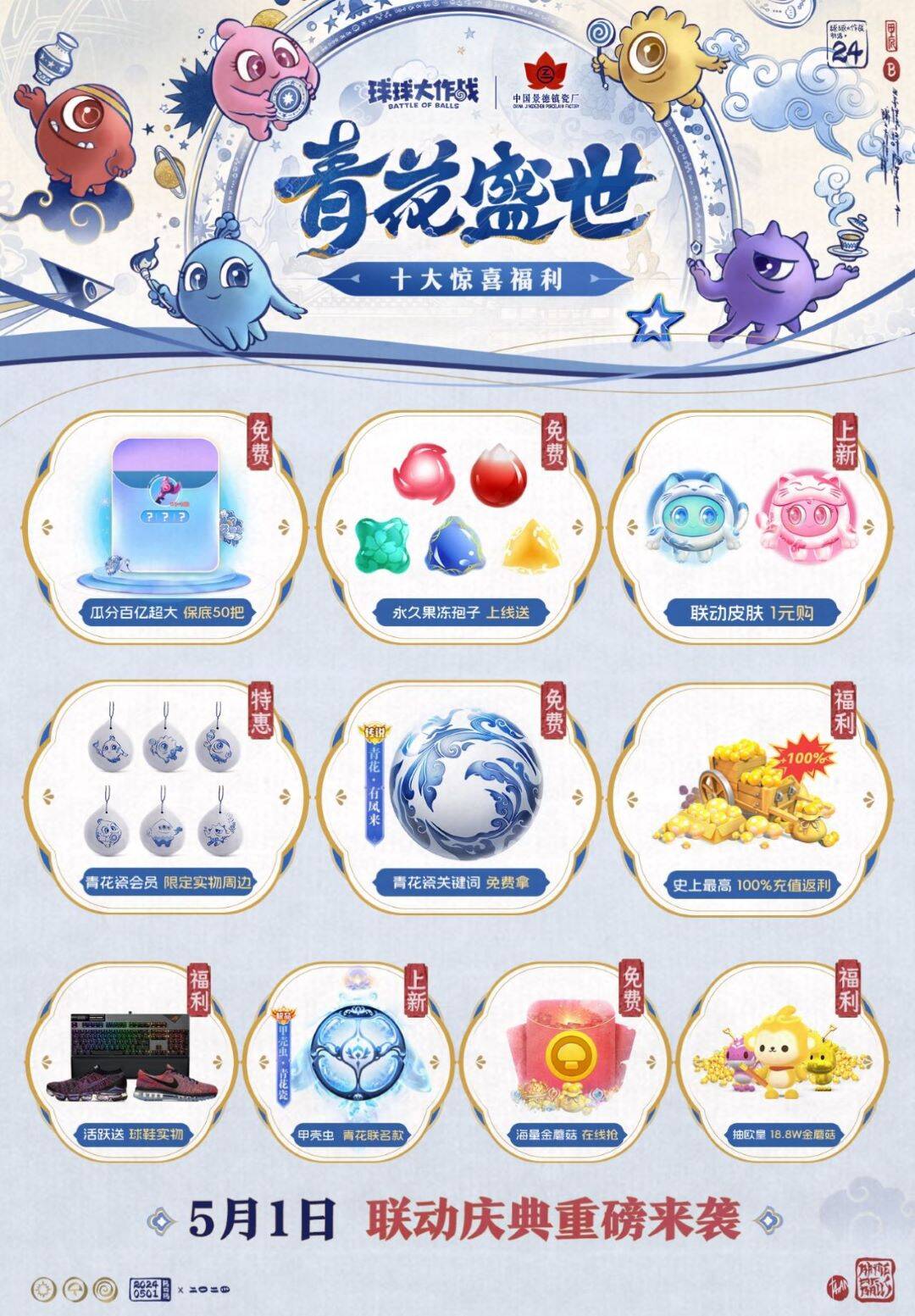 青花盛世联动庆典即将到来,《球球大作战》为各位球宝准备了包括在线抢金蘑菇、玩游戏送球鞋数码实物、参与抽五一欧皇拿18.8万金蘑菇、超值1元首充送联动皮肤、解锁青花瓷会员送限定实物周边、全部档位100%充值返利等等超多假期福利!!让你整个五月都被满满幸运所环绕,赶紧打开《球球大作战》进入青花瓷波拉哩的世界中吧!