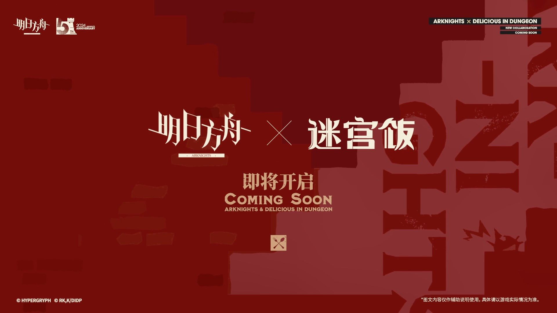 手游《明日方舟》宣布将联动《迷宫饭》,联动sidestory筹备中,目前具体的联动内容和日期尚未公布,更多细节将在之后到来。《迷宫饭》是由漫画家九井谅子创作的漫画作品,后被TRIGGER改编为同名动画,故事讲述冒险者莱欧斯与伙伴们的冒险,还有一行人取用魔物制作料理的经历。