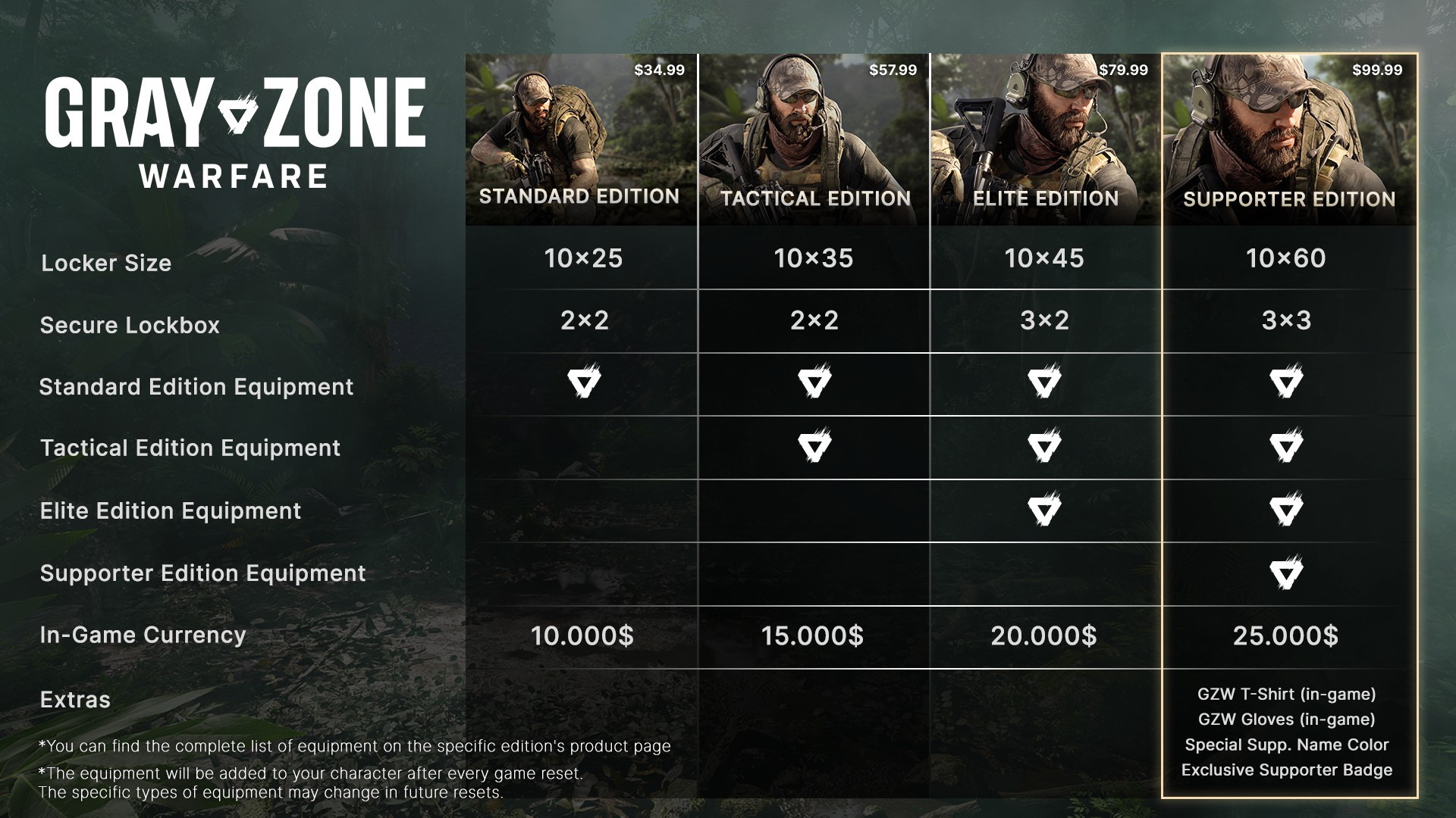 类塔科夫游戏《灰区战争》(Gray Zone Warfare)宣布将于北京时间4月29日晚上9点公布抢先体验版发售日期,官方还提前公布了游戏的定价,共有四个版本可供选择,玩家可以支付差价在每个版本之间无缝过度,并且每个版本都包含PvE和PvEvP服务器。