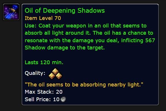 武器油最后一次出现是在9版本,它在魔兽世界的整个生命周期中有很多种形态。传统意义上,武器油是一种消耗品,能在玩家需要的地方给予他们更多的力量。随着时间的推移,武器油从简单的属性加成演变为更有趣的效果,比如暗影核心油可以在攻击时触发额外的伤害。