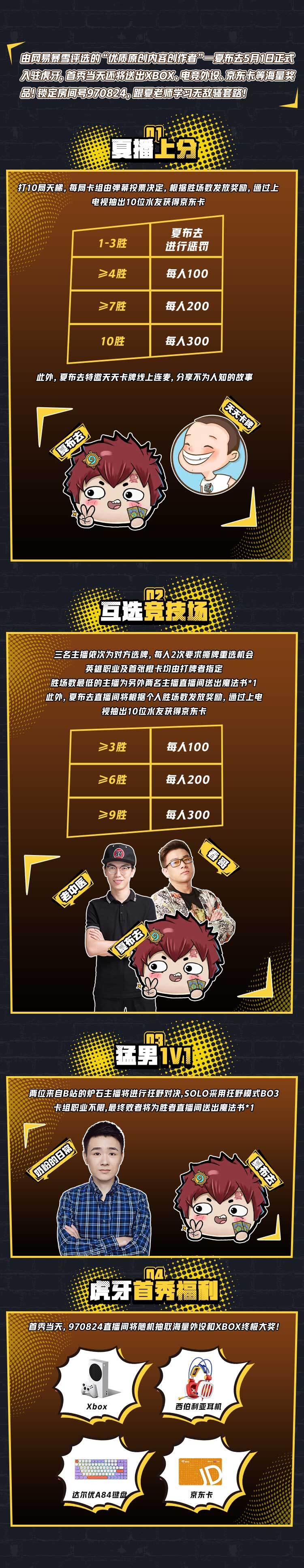 5月1日夏布去正式入驻虎牙,特邀导师天天卡牌连麦互动,还将与春哥、老中医和奶粉进行互选竞技场和狂野模式solo联动,精彩节目不容错过,直播间还将送出Xbox、电竞外设、京东卡等丰厚的奖励!
