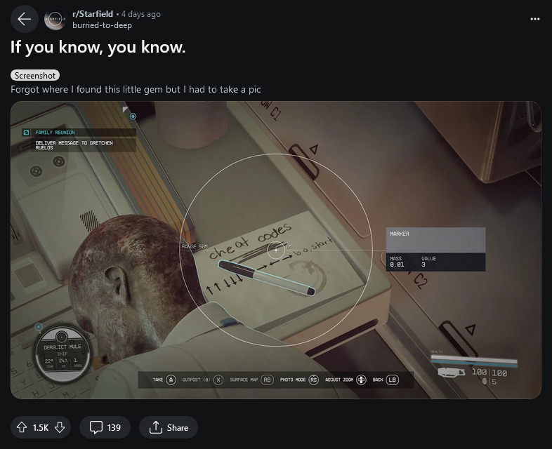在 Reddit 论坛上,用户 buried-to-deep 分享了一张游戏截图。图中在一位死去的科学家旁的一张纸上就写着这个秘籍,但这位玩家并不记得在哪里找到这张纸的。在评论中另一位玩家指出,“↓”的多输了一个,这也可能是科学家没能幸存的原因。