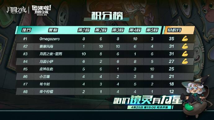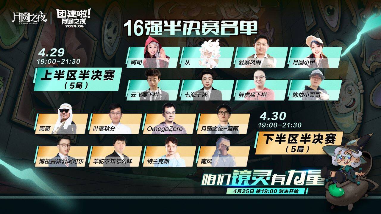 经过四天的竞技对决,十六名选手在《月圆之夜》团建赛小组赛中突围成功,其中有OmegaZero、胖虎猛下棋、特兰克斯、黑哥等老牌劲旅,也有南风、七海千秋等大热黑马,在比赛过程中机械套娃、先手龙、机械飞艇、星裔等体系均有不俗表现。半决赛精彩角逐已经进入白热化阶段,获胜的八名选手将晋级五一总决赛,敬请期待主播团建最终战,见证神仙打架之夜!