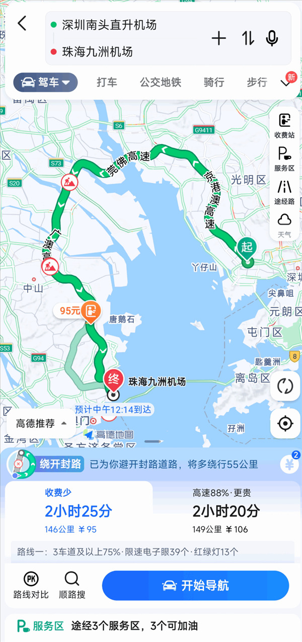 如果采用公路出行驾车方案,从深圳南头直升机场,到达珠海九洲机场,全程146公里,不堵车的情况下还要耗时2小时25分。