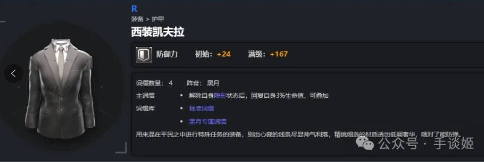 现实中的防弹西装真的和电影中一样,不光可以防弹,而且轻便好看,虽然售价高达1w5千美元,但是1w5千美元可以买个“隐形守护者”还是非常值得的,尤其是对于那些经常出没于商场和官场的大佬们。而这就是游戏中“西装凯夫拉”的原型、值得一提的是,“凯夫拉”在现实生活中也是存在的,而且是一款很好的防弹材料。
