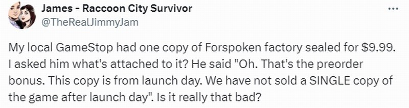 推特网友TheRealJimmyJam表示,他在GameStop花了9.99美元买到《魔咒之地》实体版,附赠预购特典。该店工作人员表示,《魔咒之地》发售后,他们没有卖出过一份。这位网友想问问:“这游戏真有那么糟糕吗?”