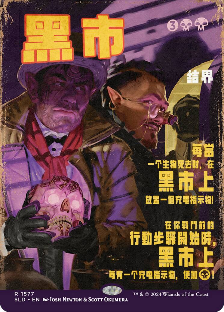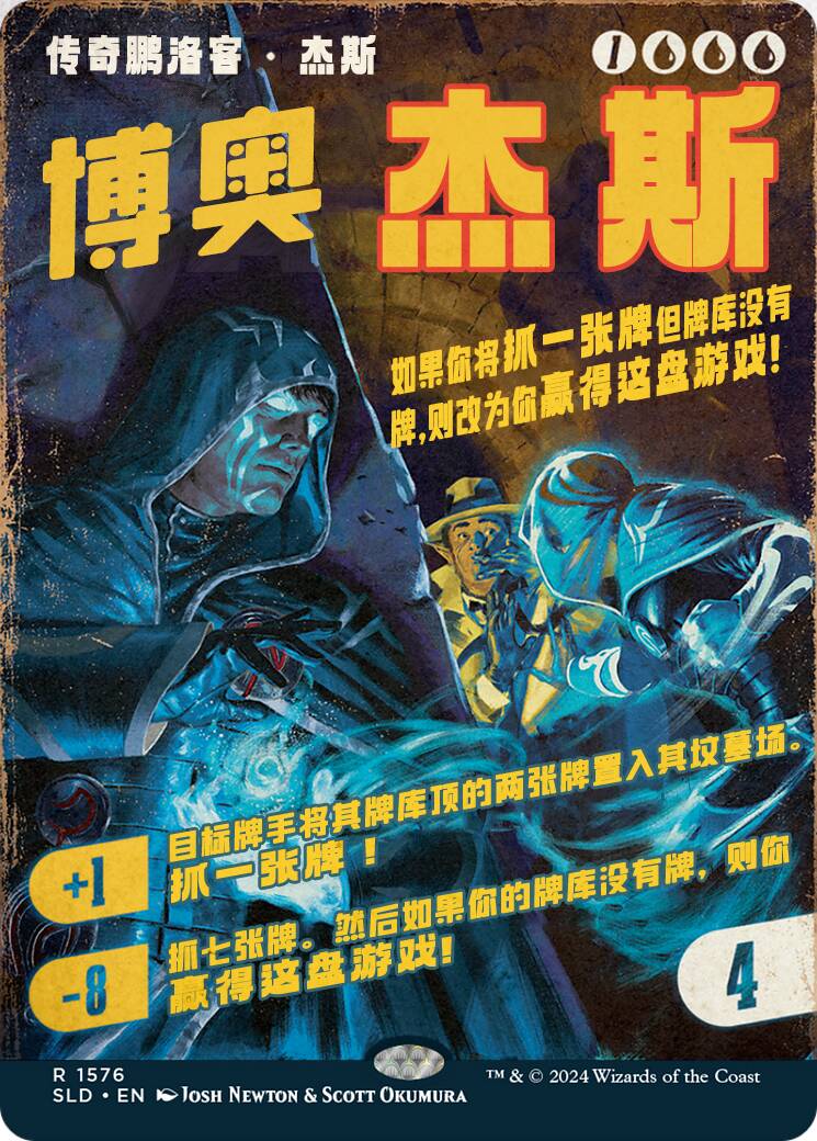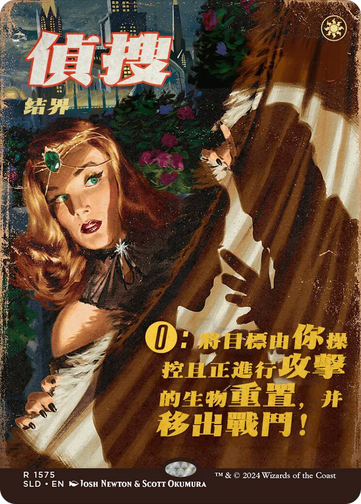 从这里不难看出负责卡面风格化的Scott Okumura(对,上次录像带SL的风格化作者也是ta)本次走的是旧悬疑杂志封面的路子。这也是我把标题翻译为“冷硬派悬疑”的原因。发黄的纸质效果,艺术字标题体现的卡名和代替内容摘要出现的规则文本。因此这次汉化我也尽量试着还原这种风格,并试试看能不能带出一点中文老杂志/老电影海报的调子。尝试用中文版式去贴近这个英文排版困难重重,做完之后甚至有种精疲力竭的感觉。如果各位有什么更好的字体或是排版的建议,也希望大家能不吝指出!