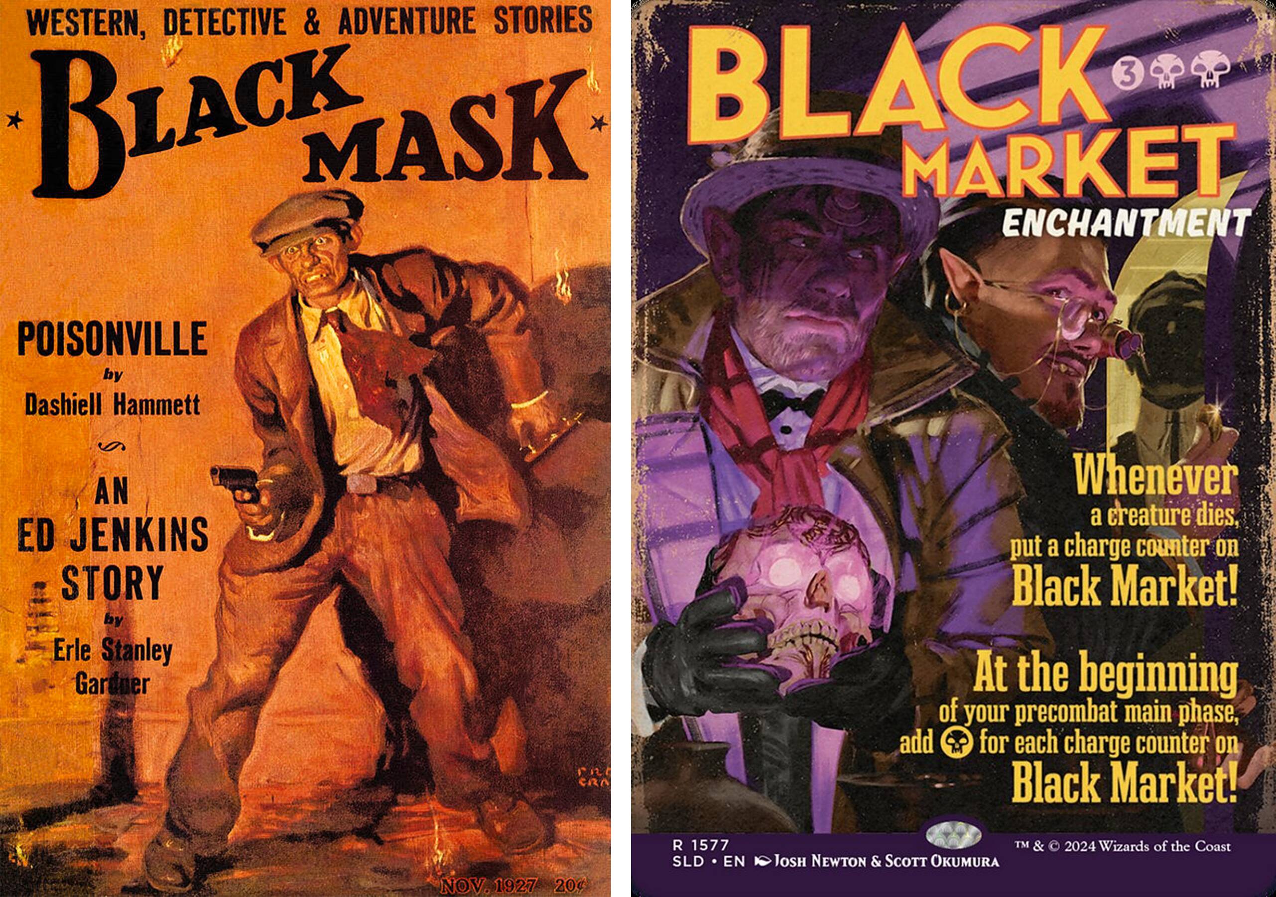 左图为初次连载《血色的收获》的美国著名悬疑杂志Black Mask封面,右图为本次sl版本的黑市。