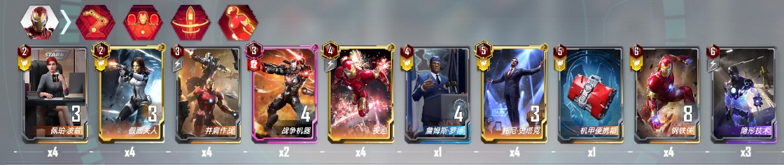 钢铁侠技能及替卡方面:技能可以带能量核心和战甲升级 罗德可以换成其他卡 5本箱子可以换掉 6本看环境 幻象秘境魔什么多的可以带冲击光束 隐形技术尽量带满 后面有大用