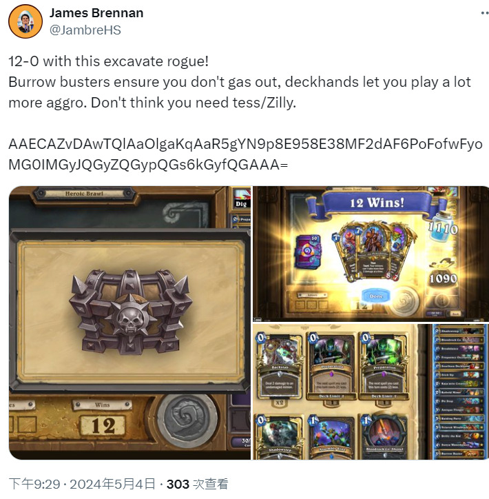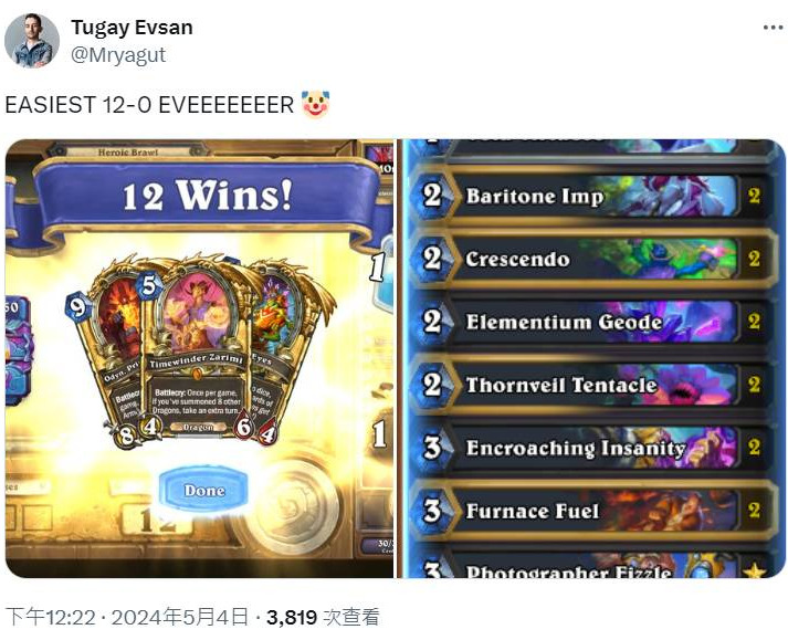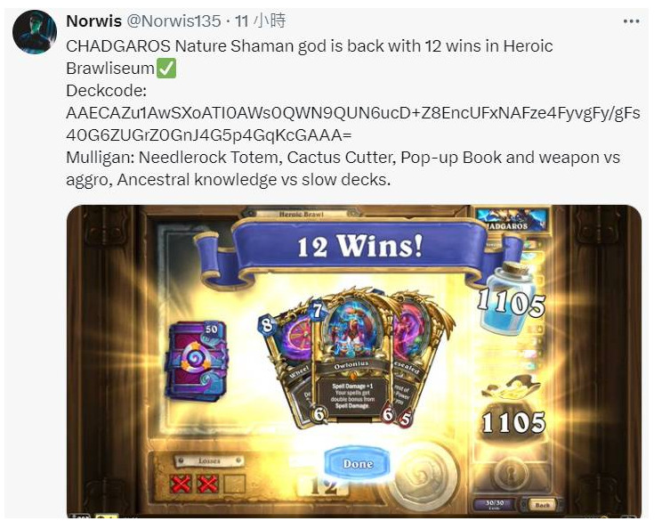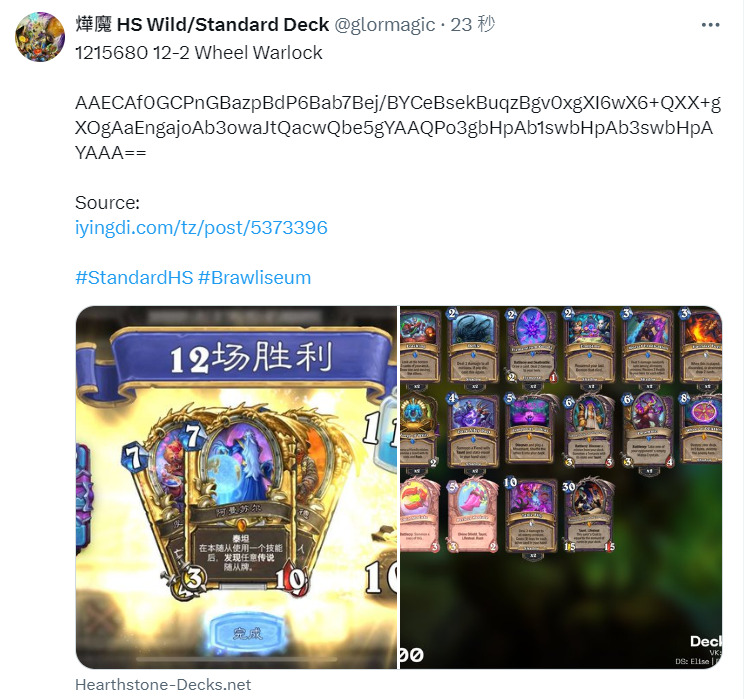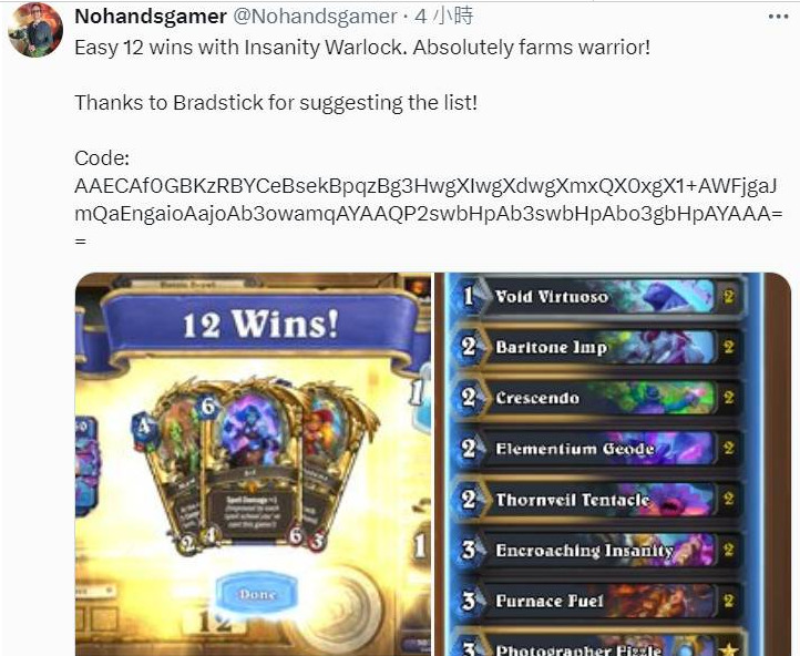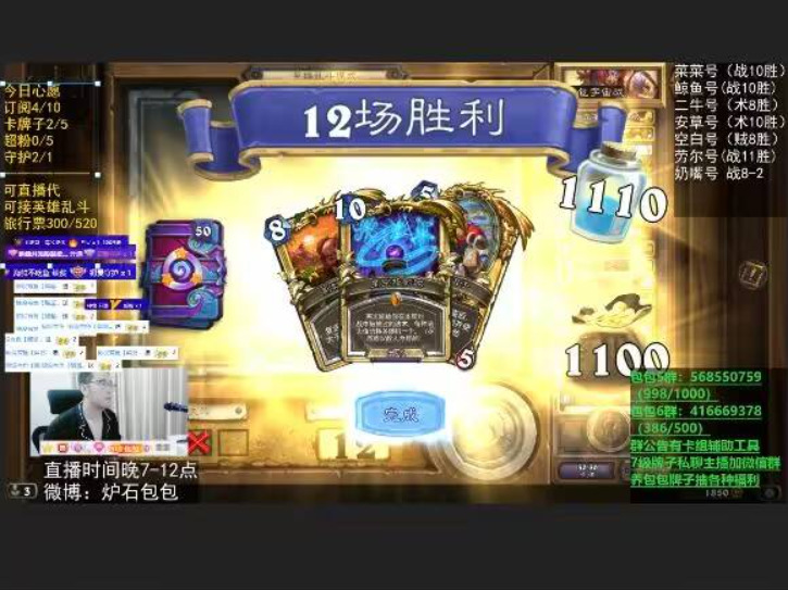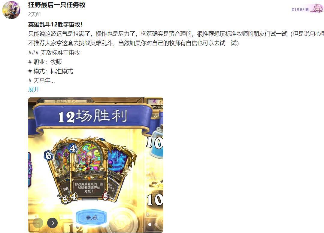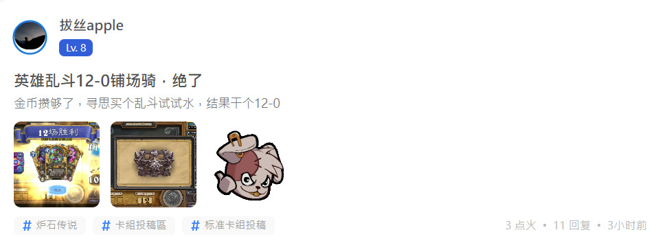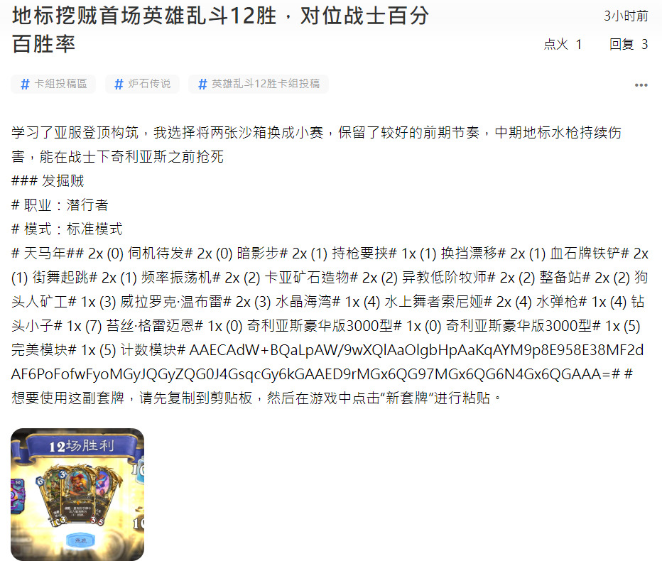 欢迎大家在营地卡组投稿社区发帖分享你打到12胜的卡组,附上卡组代码及12胜截图,标上卡组名几-几,最重要的是帮我们选择"英雄乱斗12胜卡组投稿"的标签,我们有空的时候比较方便做搬运,感谢大家!!