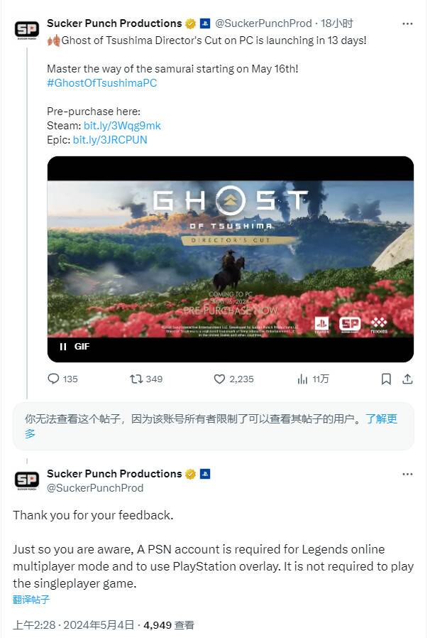 不过好消息是,根据Sucker Punch官推,《对马岛之鬼》PC Steam版,游玩单人模式并不需要PSN账户,只有游玩游戏的在线合作模式——奇谭模式才需要PSN账户,一方面这是为了支持跨平台联机,另外一方面也是为了使用PlayStation的overlay功能。