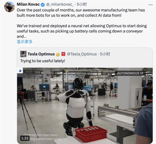特斯拉机器人团队工程Milan Kovac发推文称,“擎天柱”使用的神经网络完全是端到端运行,只利用机器人的2D摄像头视频和机载自传感器,直接生成关节控制序列,因此其完全靠视觉辅助和人类示范进行训练。