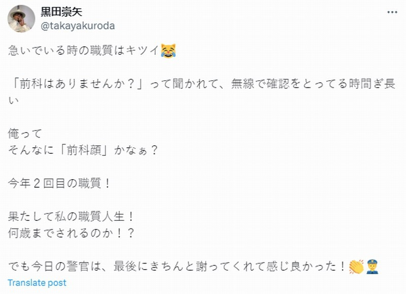 黒田崇矢表示,在赶时间的时候碰到警察盘问真累人,警方质疑他“你没有犯罪前科吗”,并花了很多时间通过无线电确认他的身份没问题。他怀疑自己是不是长了一个“犯罪脸”?