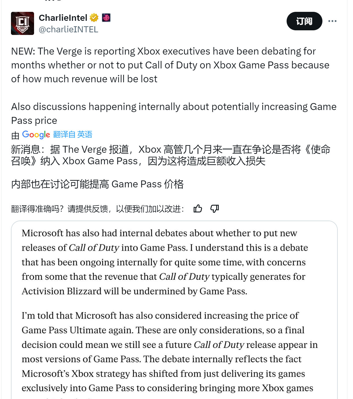 更有趣的是,Warren写道,微软还“考虑”提高Xbox Game Pass Ultimate版本的订阅价格。和《使命召唤》新作加入Game Pass 一样,涨价目前也仅处于讨论阶段,尚未最终确定。不过,Warren推测,涨价可能意味着未来的《使命召唤》新作将出现在“大多数版本的Game Pass”上。