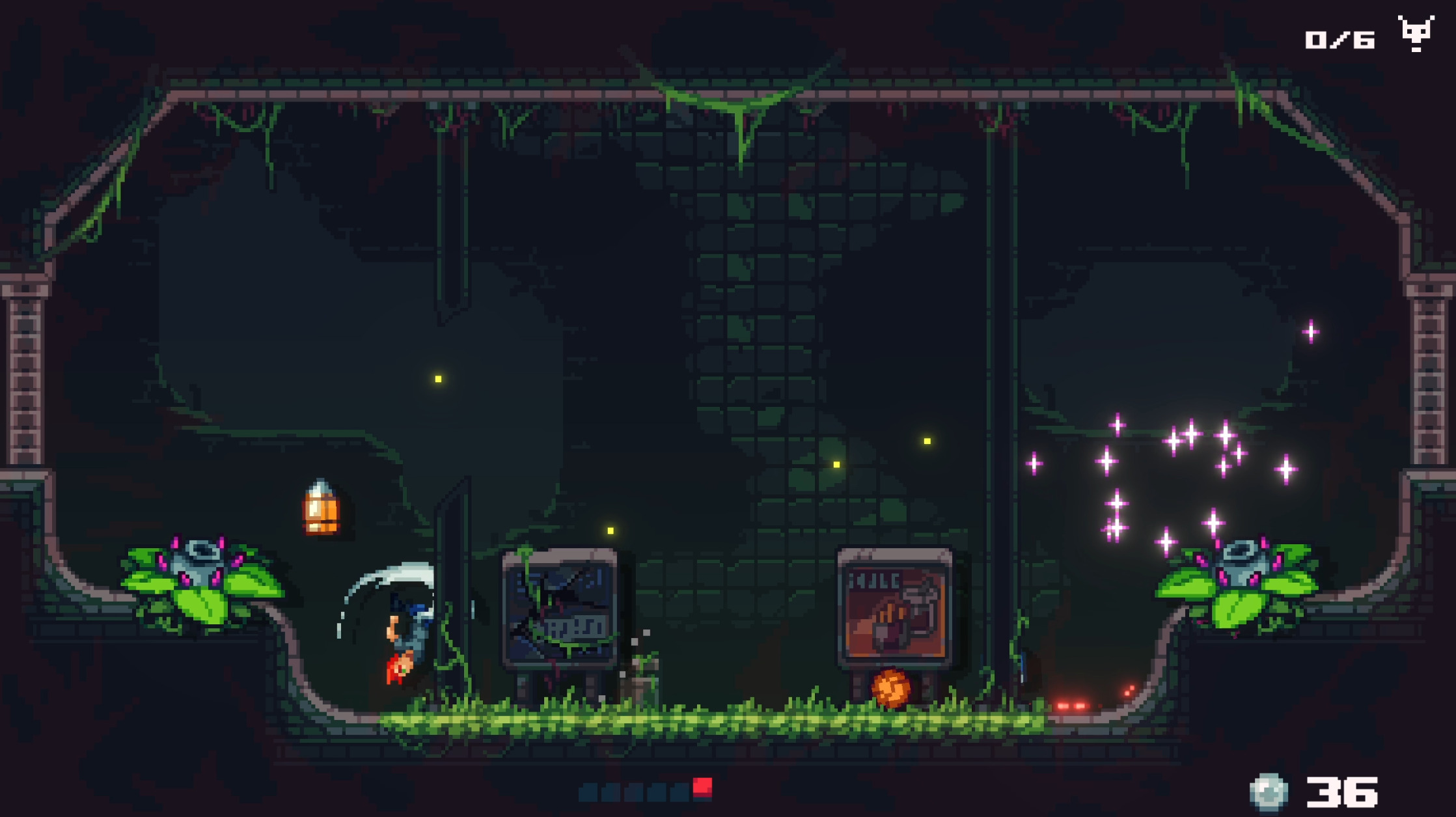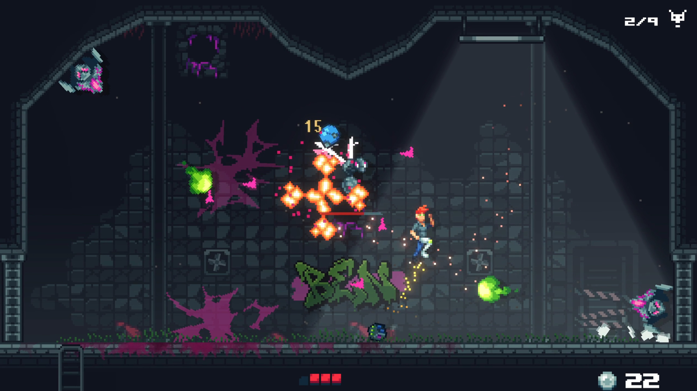 敌人的种类算不上丰富,但也足够玩家喝上一壶。在第一关击败了虫子之后,难度就会陡然提升。无论是工厂中的旋转乌龟还是森林里喷射花粉的大王花,都能让初见玩家汗流浃背。如果你技术不佳,那就一切从头来过。而每个关卡的敌人设计都有自己独特的机制,并非简单的增强数值。怪物的同屏数量也受到了限制,每个刷新点最多会刷新出两只怪物。这降低了玩家的输出压力,但如果怪物存活时间过久,就会进入狂暴模式,攻击频率会极大的提升。