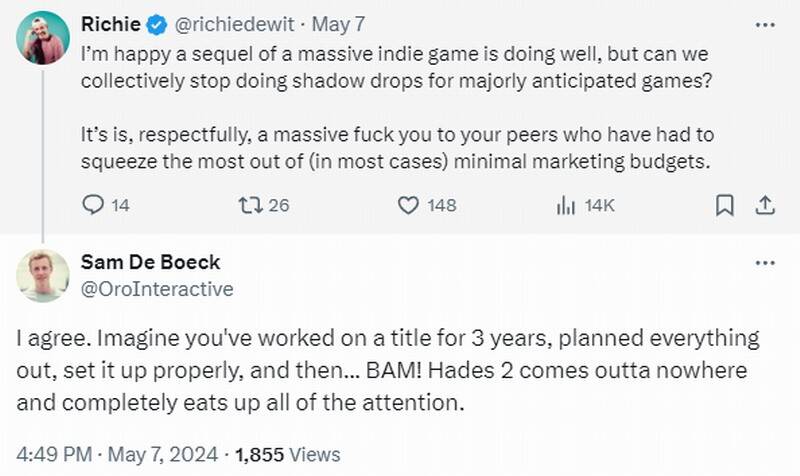 SteamDB数据显示,《黑帝斯2》在24小时内就达到80000名玩家的峰值,让粉丝们非常高兴。然而一些独立开发者却不高兴了,Richie de Wit发推文称,对于预算较少的小工作室来说,这种“突袭式”发布的做法并不特别公平。