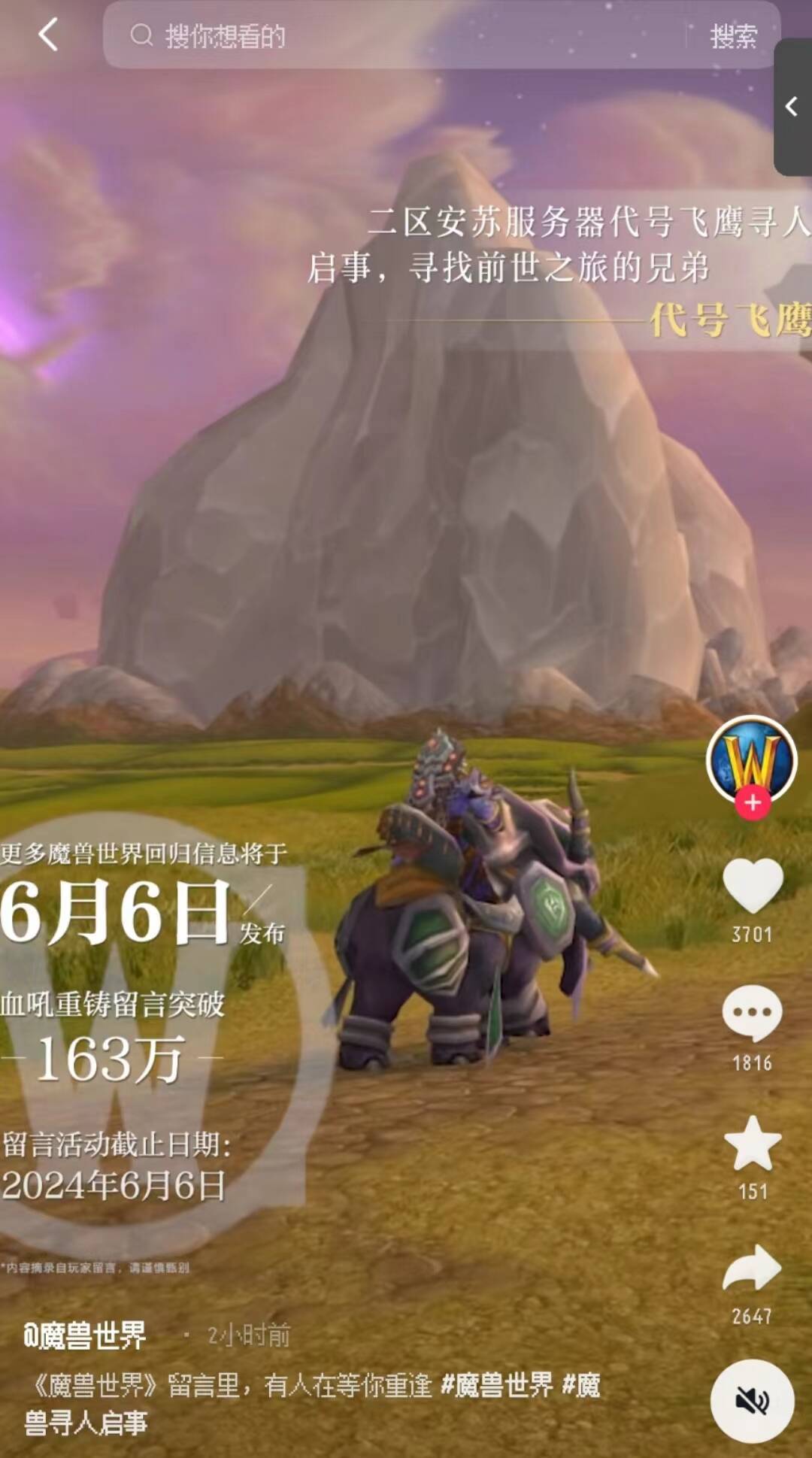 同时,在今天中午12点,《魔兽世界》官方抖音号发布了一条寻人启事视频,视频内提到,官方将于6月6日发布更多魔兽世界回归相关信息。