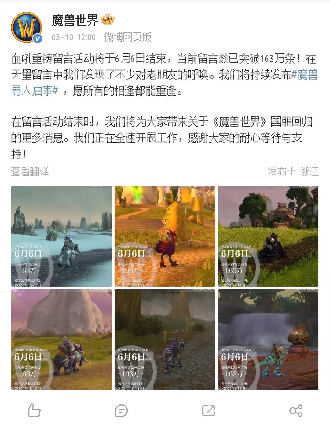 在官宣开服一个月后的今天,《魔兽世界》官方宣布,血吼重铸留言活动将于6月6日结束,当前留言数已突破163万条,并将持续发布魔兽寻人启事让老玩家朋友能再次相聚。