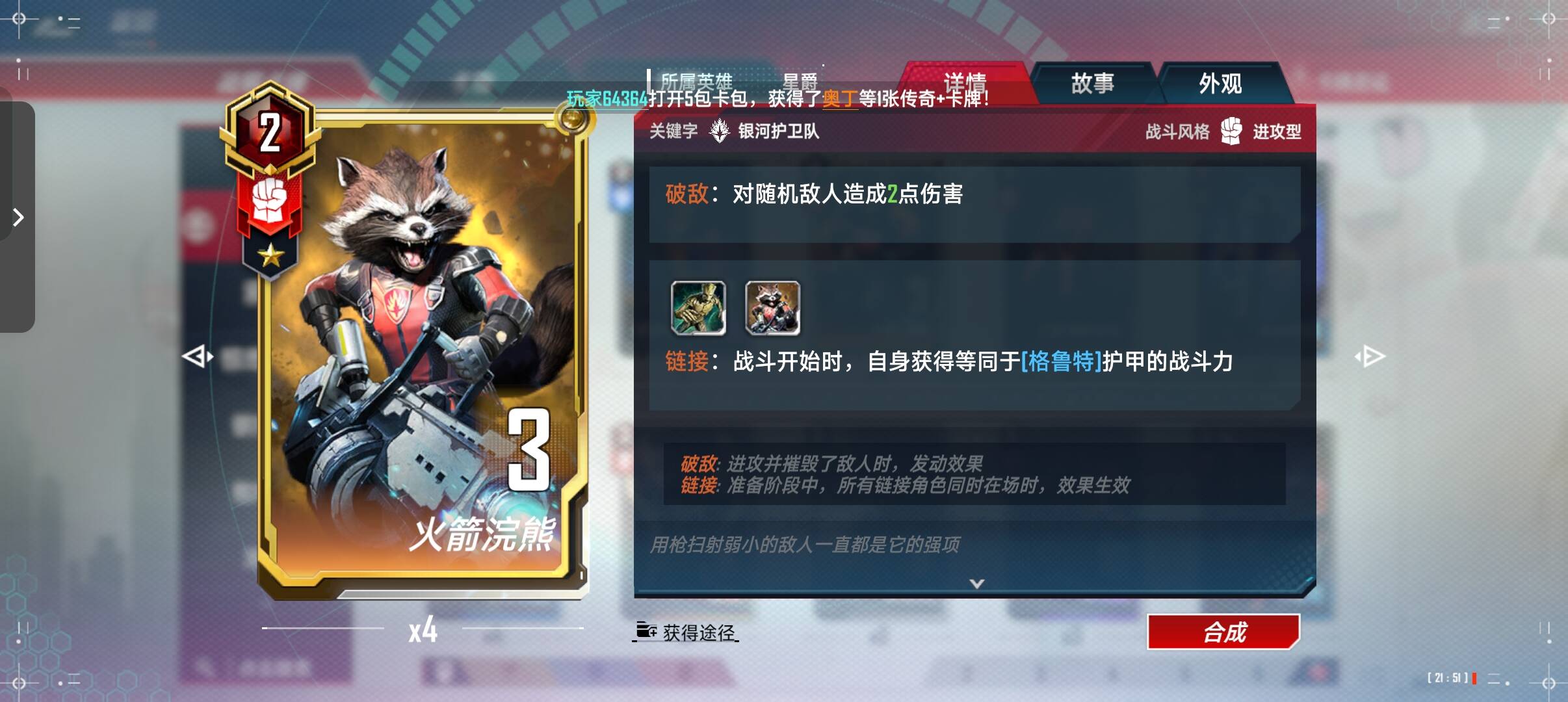 解锁链接需要16个链接石头/4800对应卡组的结晶(抽到重复的卡会自动分解成结晶),链接触发需要对应的卡同时在场,以小浣熊链接为例,小浣熊和格鲁特同时在场时,战斗开始小浣熊会增加格鲁特护甲值得战斗力,当你的格鲁特护甲足够高时你就有了一个大杀器,这就是很多卡组会带3个小浣熊,你可以拥有两个大杀器😆