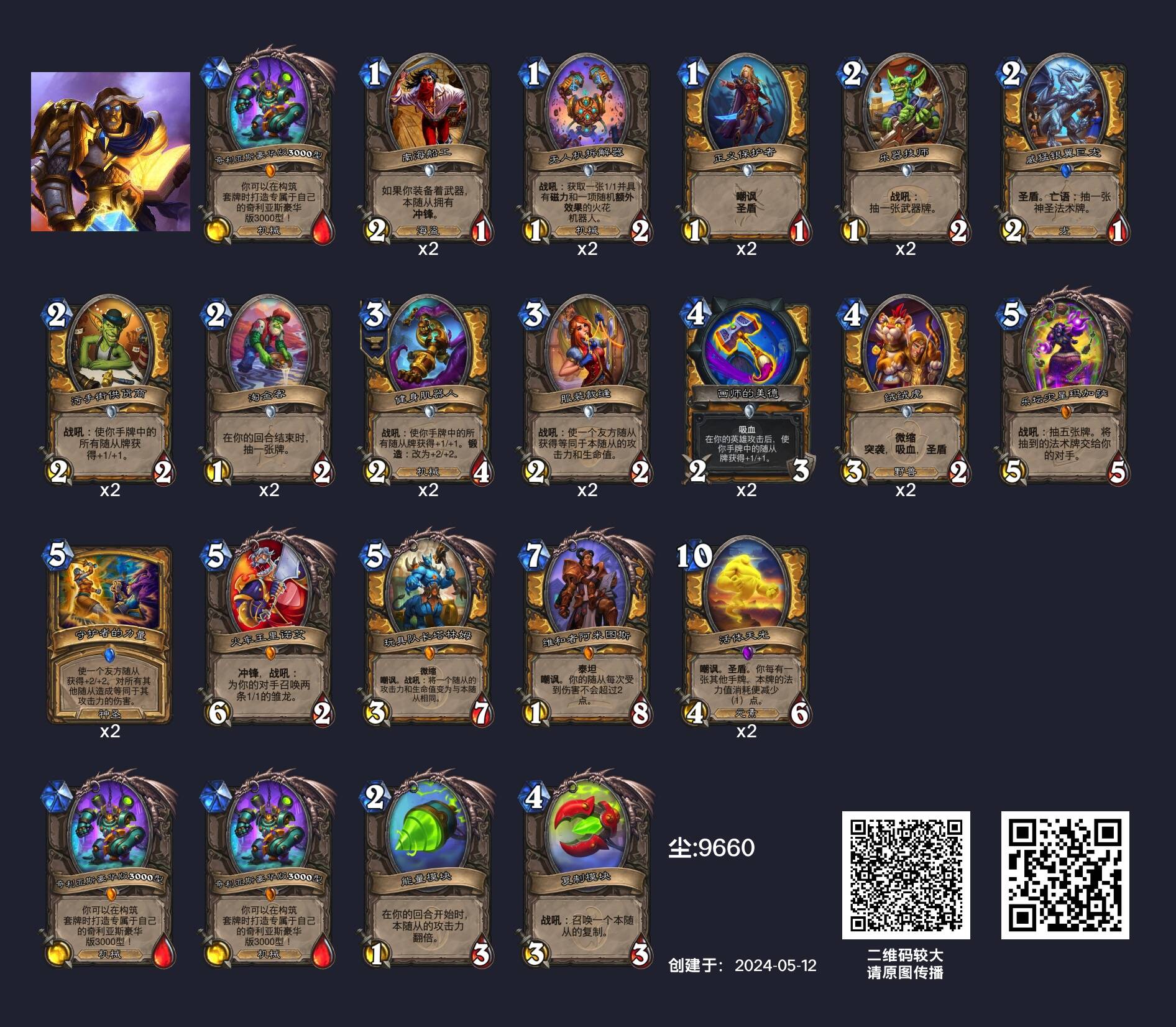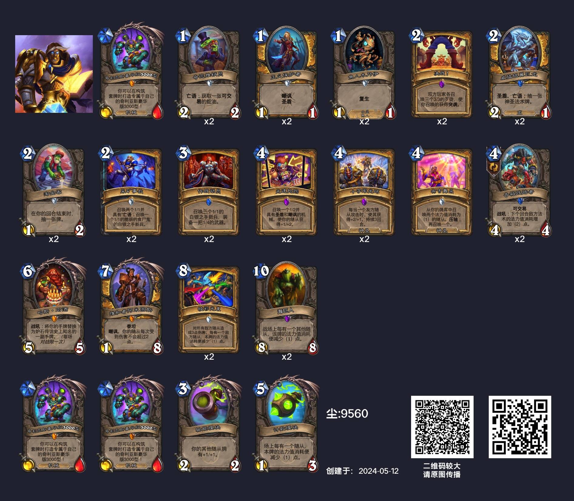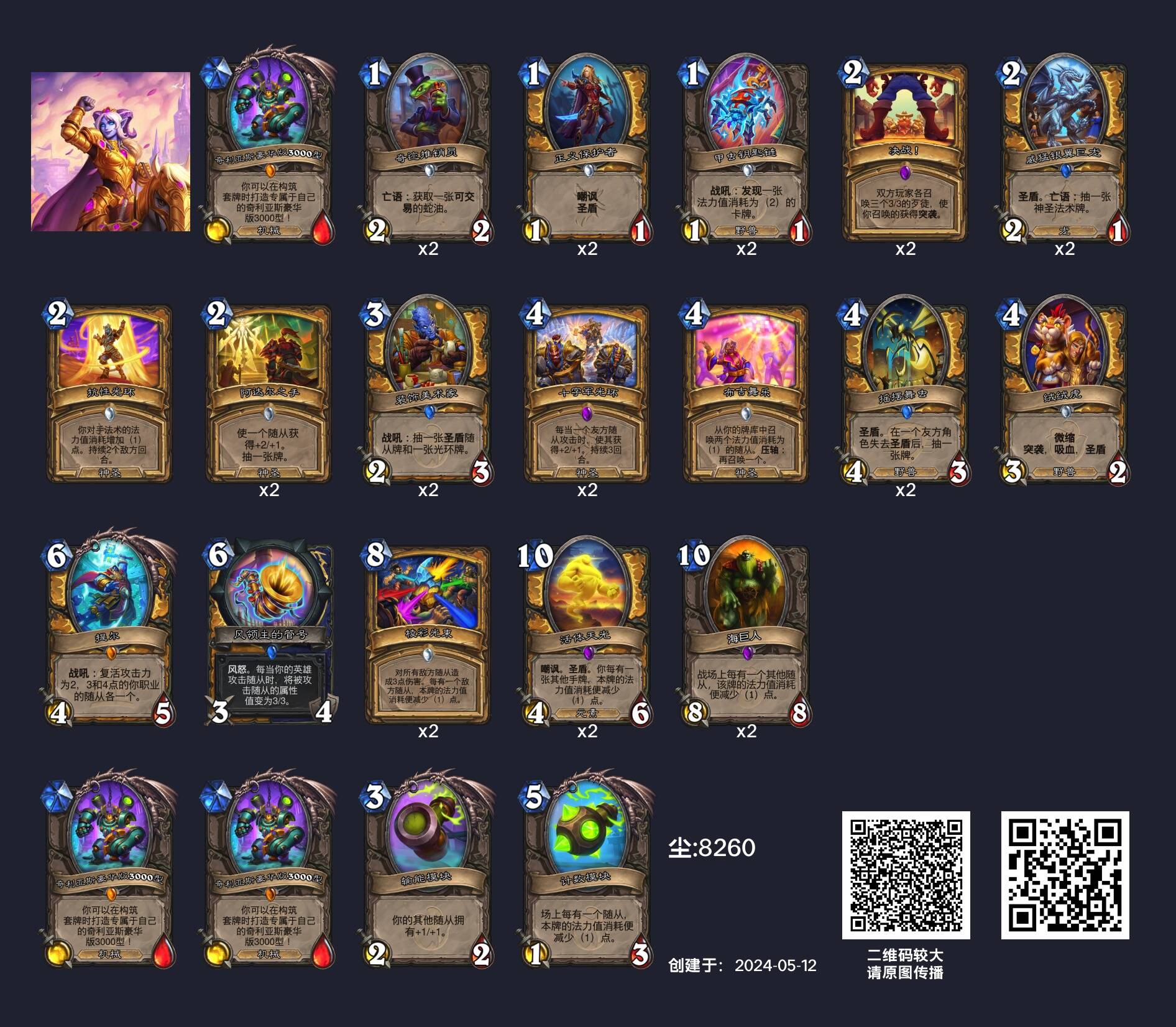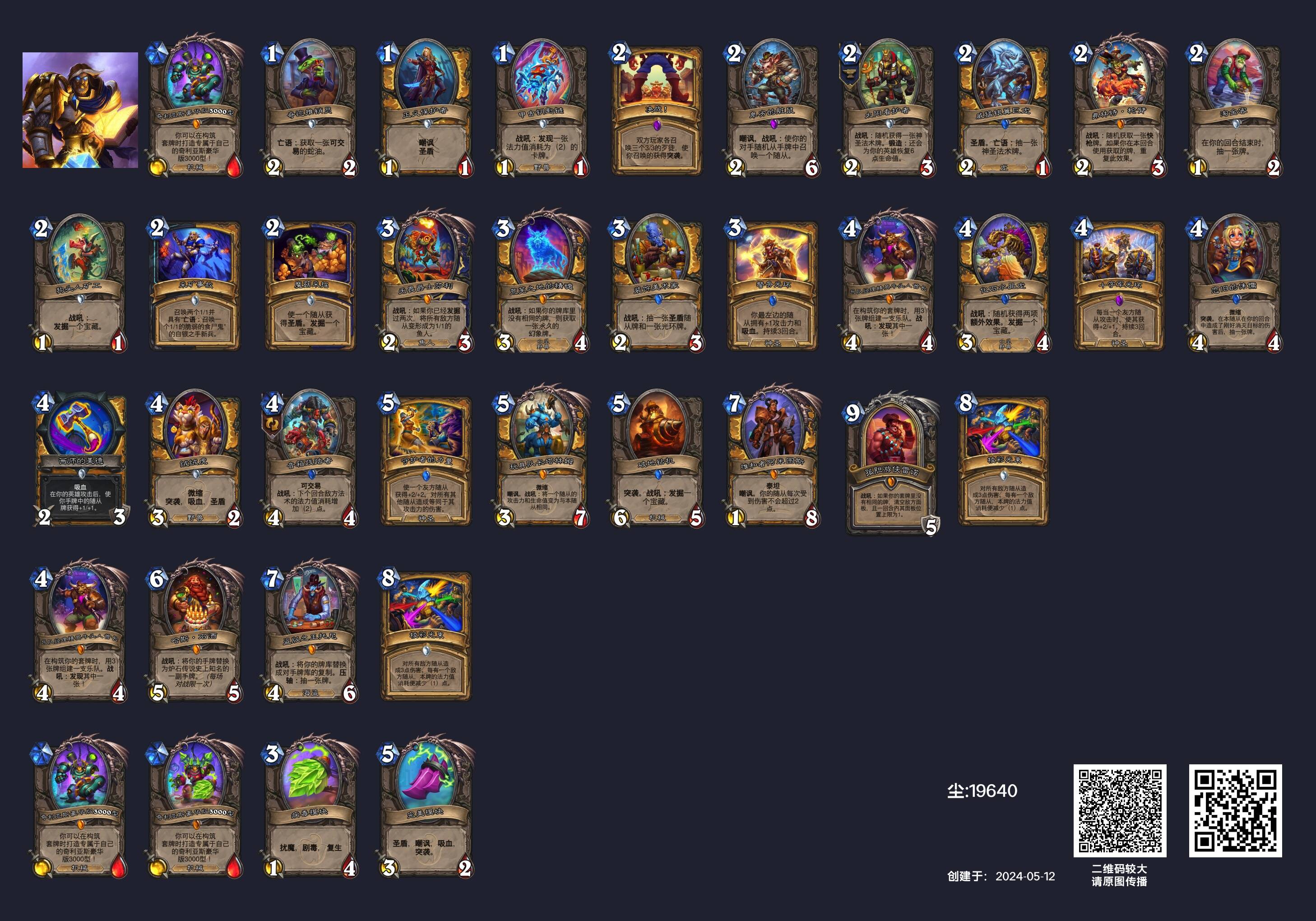 但事实上,当前环境中面对铺场骑的两大优势对局,环境中其实有两套铺场骑的“上位替代”。九千羽在疲劳术风行前就一直使用的中速骑(或者说光环骑)在干扰能力和续航能力上都比原构筑更强,摇摆舞虫、提尔可以为卡组提供优秀的续航,而抗性光环的干扰也更加持久。而且难能可贵的是这套卡组在对上环境中残存的宇宙战时也不像传统铺场骑一样吃胡,我甚至感觉这是个优势对局。因此只要你所在的环境中猎人没有占到绝对多数(这环境猎人占绝对多数也挺难的),中速骑就是比铺场骑更适合当前环境的存在。另一个“上位替代”宇宙骑则主抓骑士内战和快攻,但是这套卡组也有和传统铺场骑一样的问题——不好打战士,至少不如污手骑和中速骑好打战士,因此只适合作为环境中骑士较多时作为后手counter卡组使用。