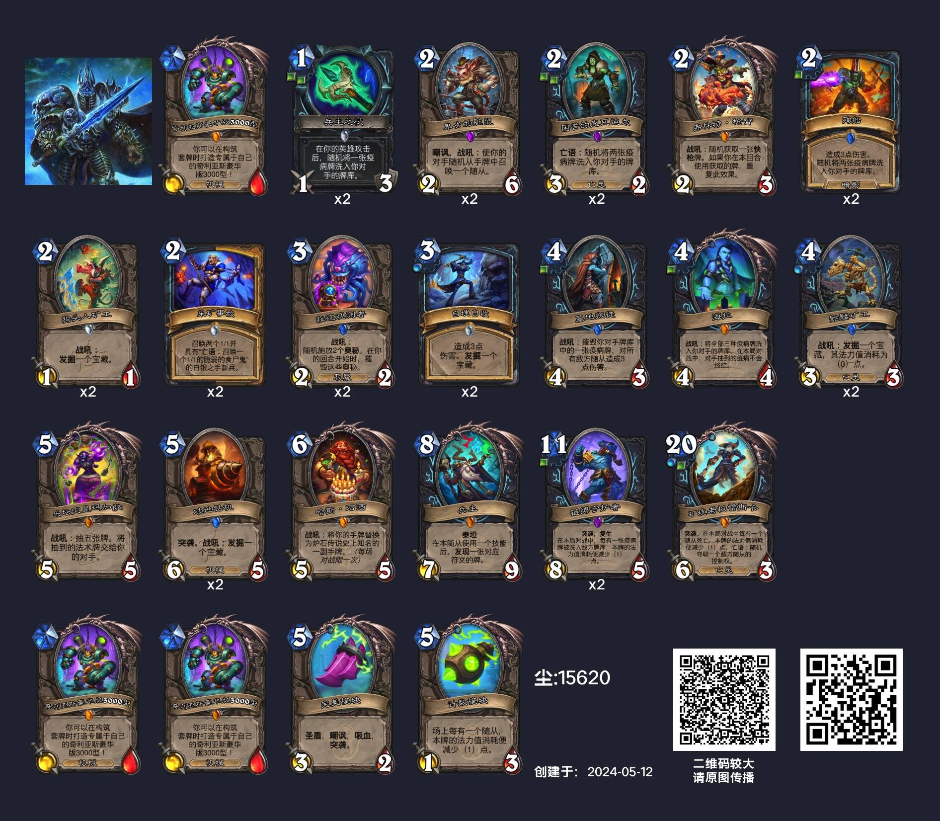 与上周相比,本周病DK的环境其实稍微好了一点:疲劳术和战士相比血更少、抽牌更快更多,而且疫病还可以消耗邪弦竖琴的耐久。但也只是“稍好一点”而已,疲劳术相比战士平均回合数更短,而且前中期的强力展开也是对于病DK自身牌序的极大考验,而且热度不断提升的各路骑士的进攻场面也很难应对。从某种角度来说,病DK可以算是这个版本的“败犬卡组”的一个缩影:这些卡组往往只具备基本的进攻能力,但是进攻能力不足以强到利用到宇宙战和污手骑前中期的弱势赢下对局;防守能力、回血能力也相当一般,在疲劳术、挖掘贼、铺场骑面前也很难依靠防守制胜。