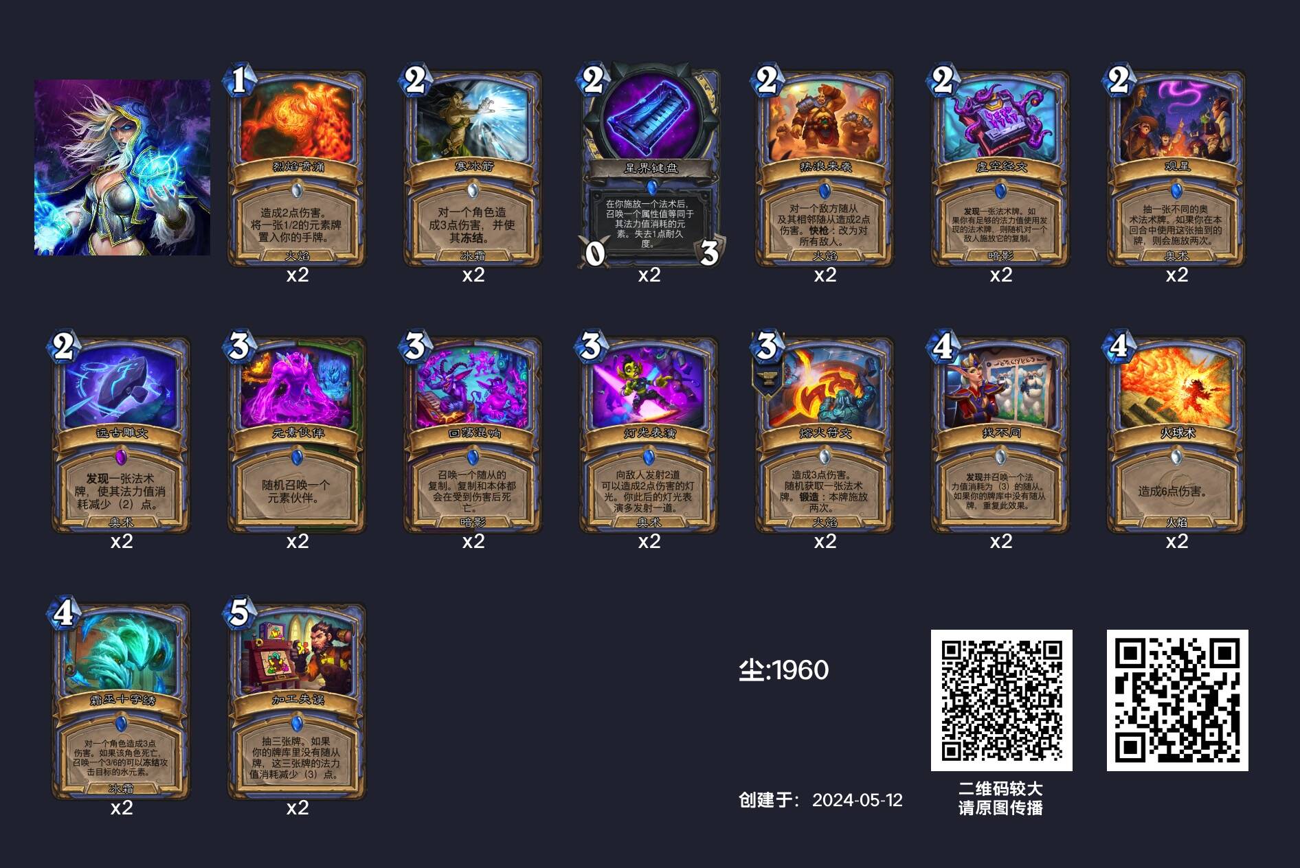 法术法抛弃了原本的围绕星辰能量进行构筑的基本思路,转而携带更多的前中期伤害以及法师为数不多前期看得过去的随从召唤法术——元素伙伴和霜巫十字绣,力求在游戏前中期就能通过灌伤害获胜。这一构筑改变当然在一方面体现了环境从宇宙战主宰到疲劳术定义的整体薄化,但是在另一方面也体现了这个版本法师深深的无奈:由于前中期没有太多能站场打架或是配合直伤抢血的随从(及随从召唤法术),只能尽量多带伤害。从我个人的实际体验来看,目前法师的进攻能力甚至都未必比得上游戏前五年的包 子法……希望未来法师可以获得更多其他思路的补强吧,灌伤害真的已经跟不上时代了。